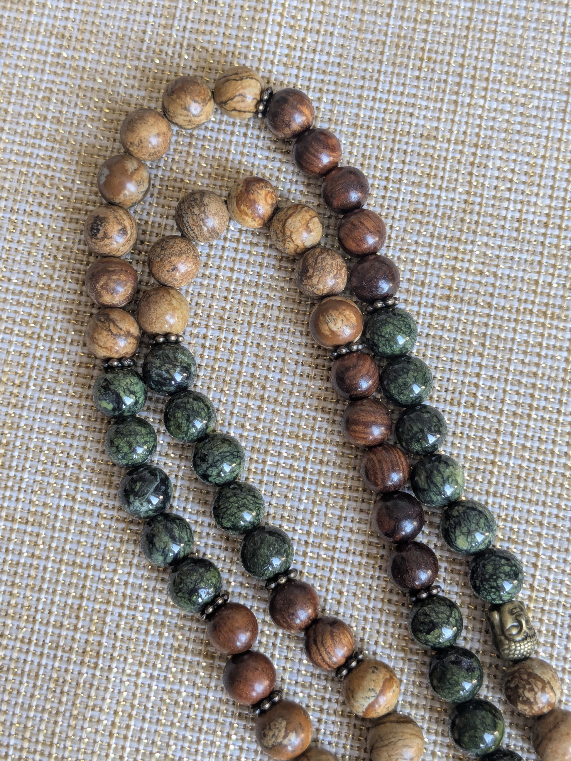 Découvrez ce magnifique mala de confection artisanale qui vous accompagnera dans toutes vos méditations. Il est composé 108 perles naturelles en Serpentine, Jaspe paysage et bois.