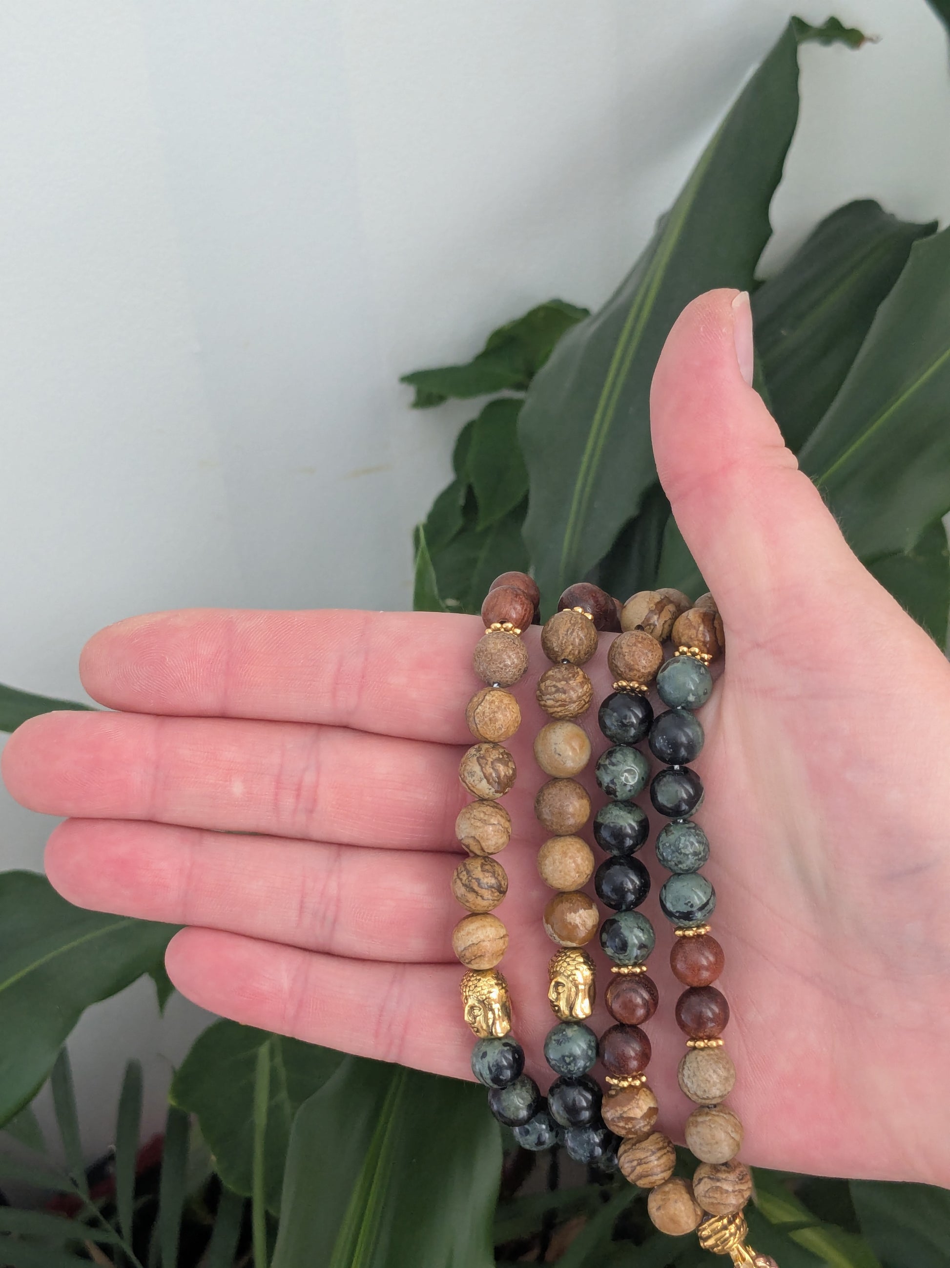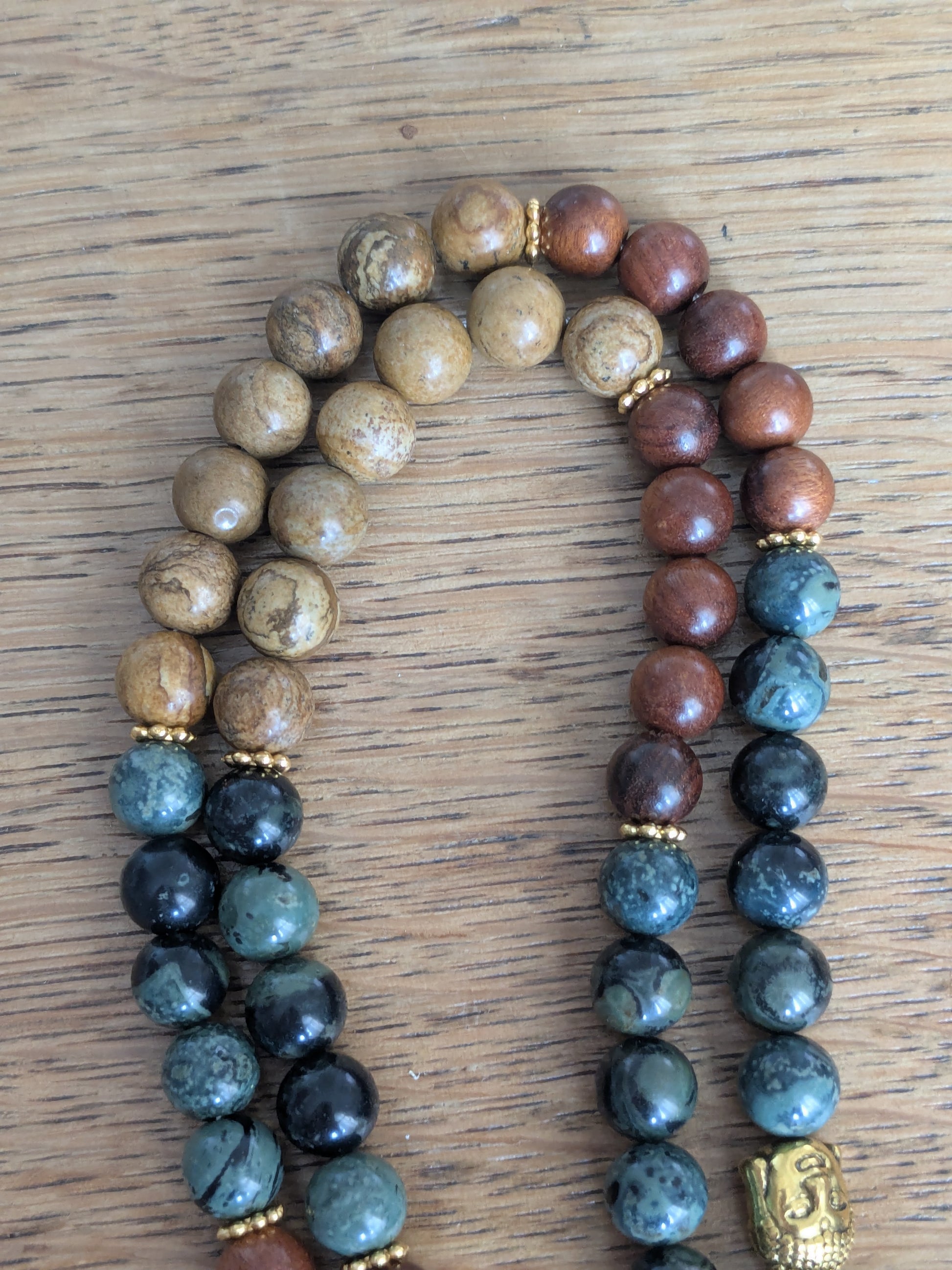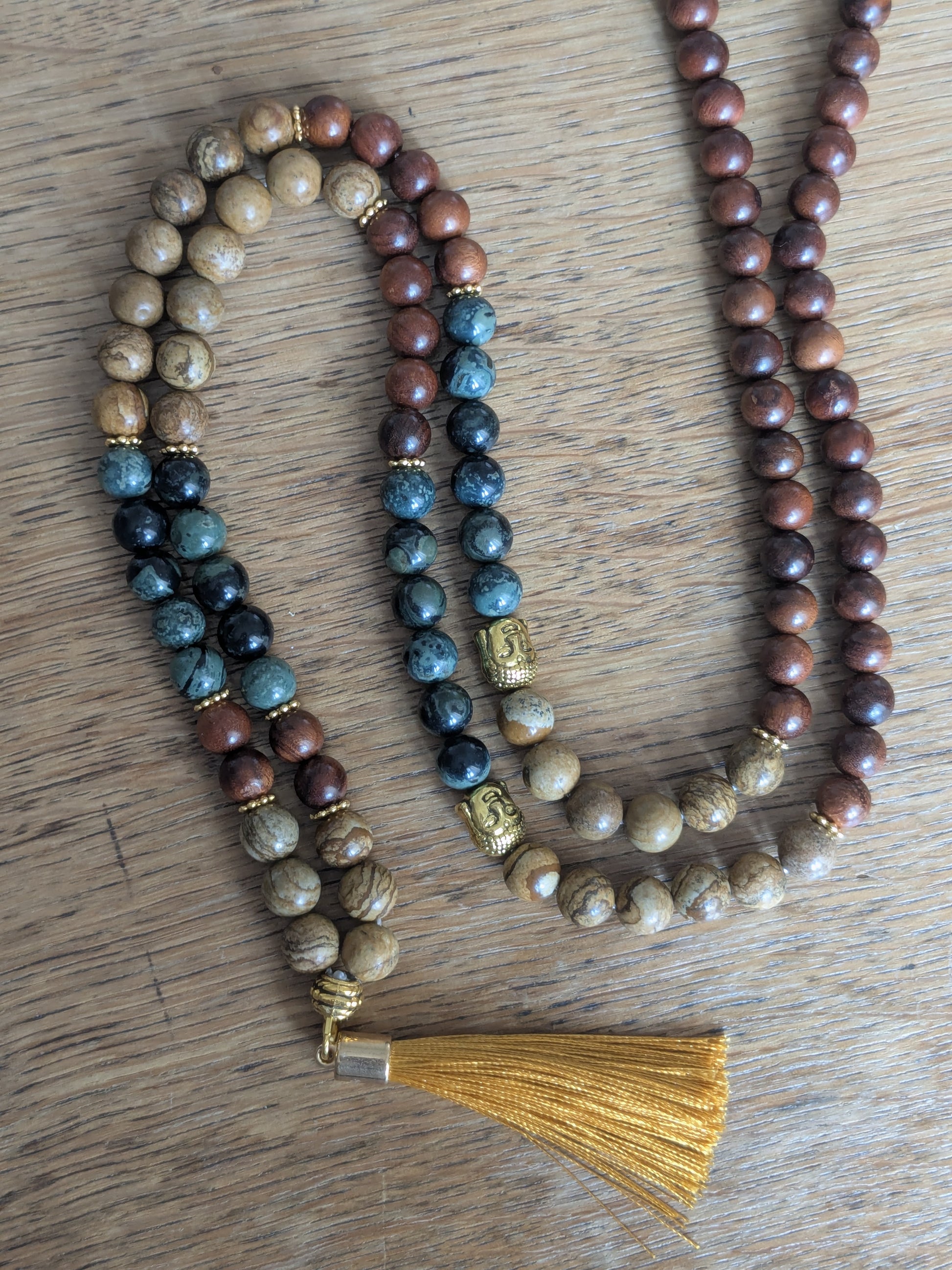 Découvrez ce magnifique mala de confection artisanale qui vous accompagnera dans toutes vos méditations. Il est composé 108 perles naturelles en Jaspe Kambaba, Jaspe paysage et Bois brun de coco.