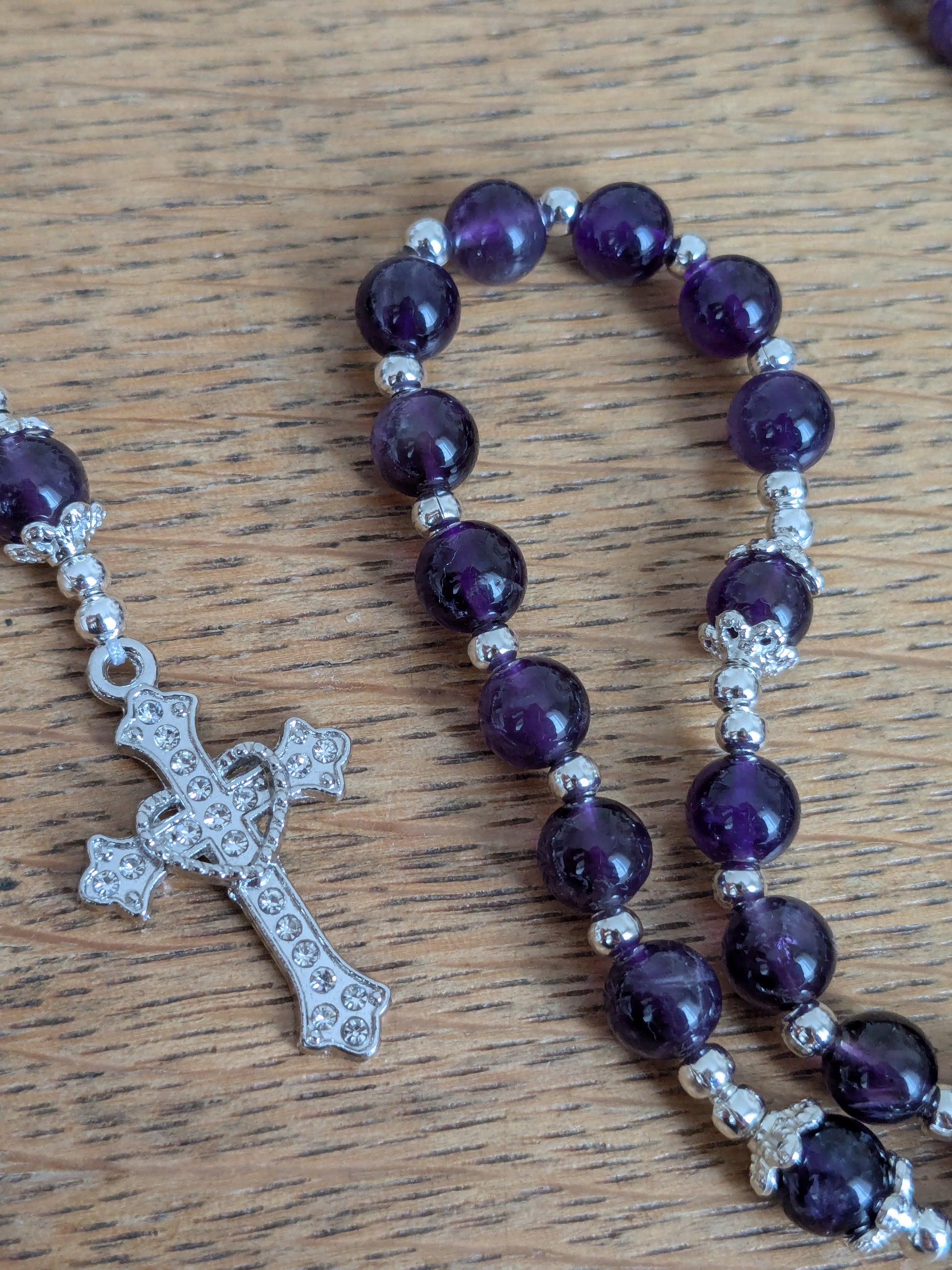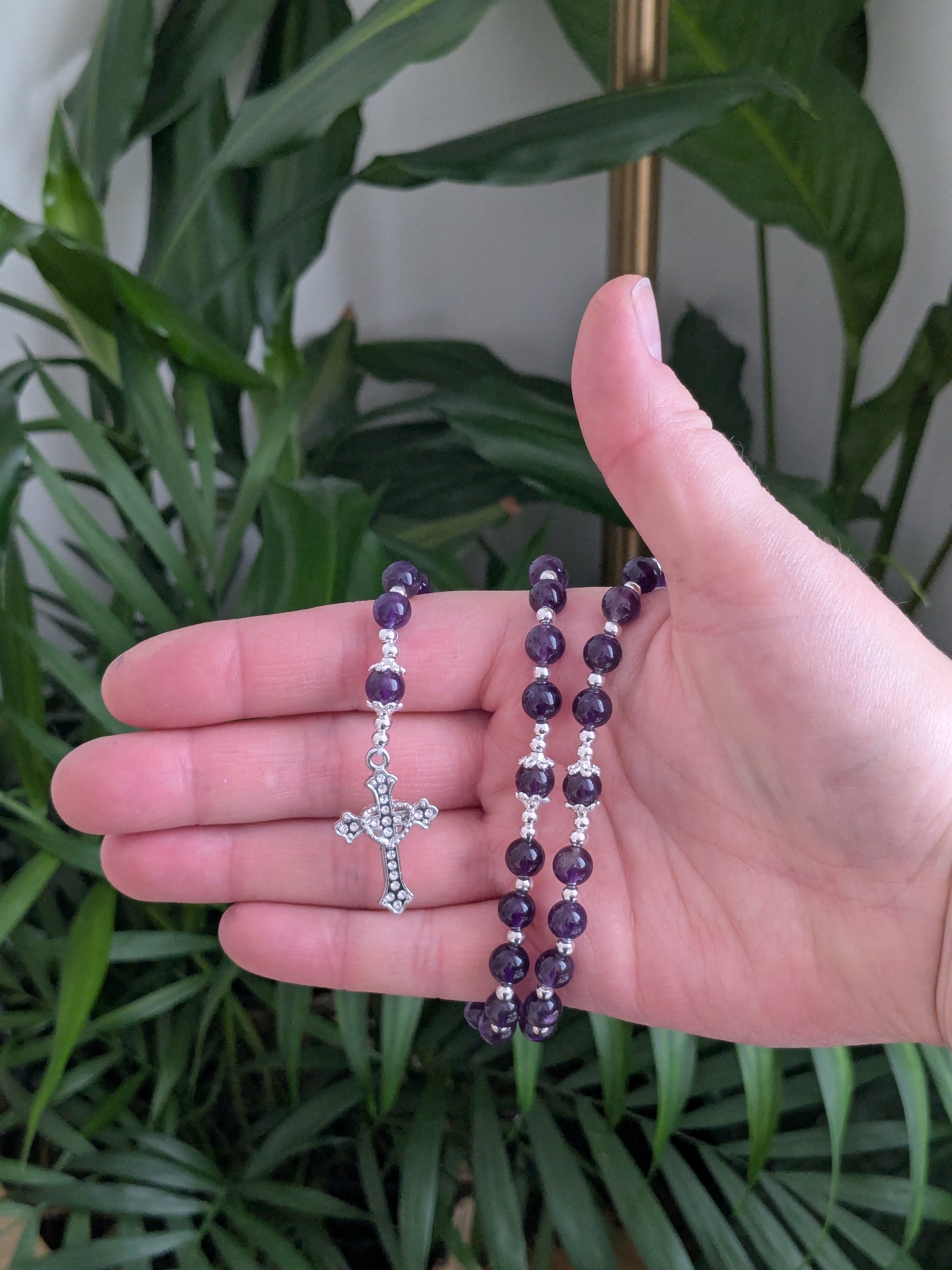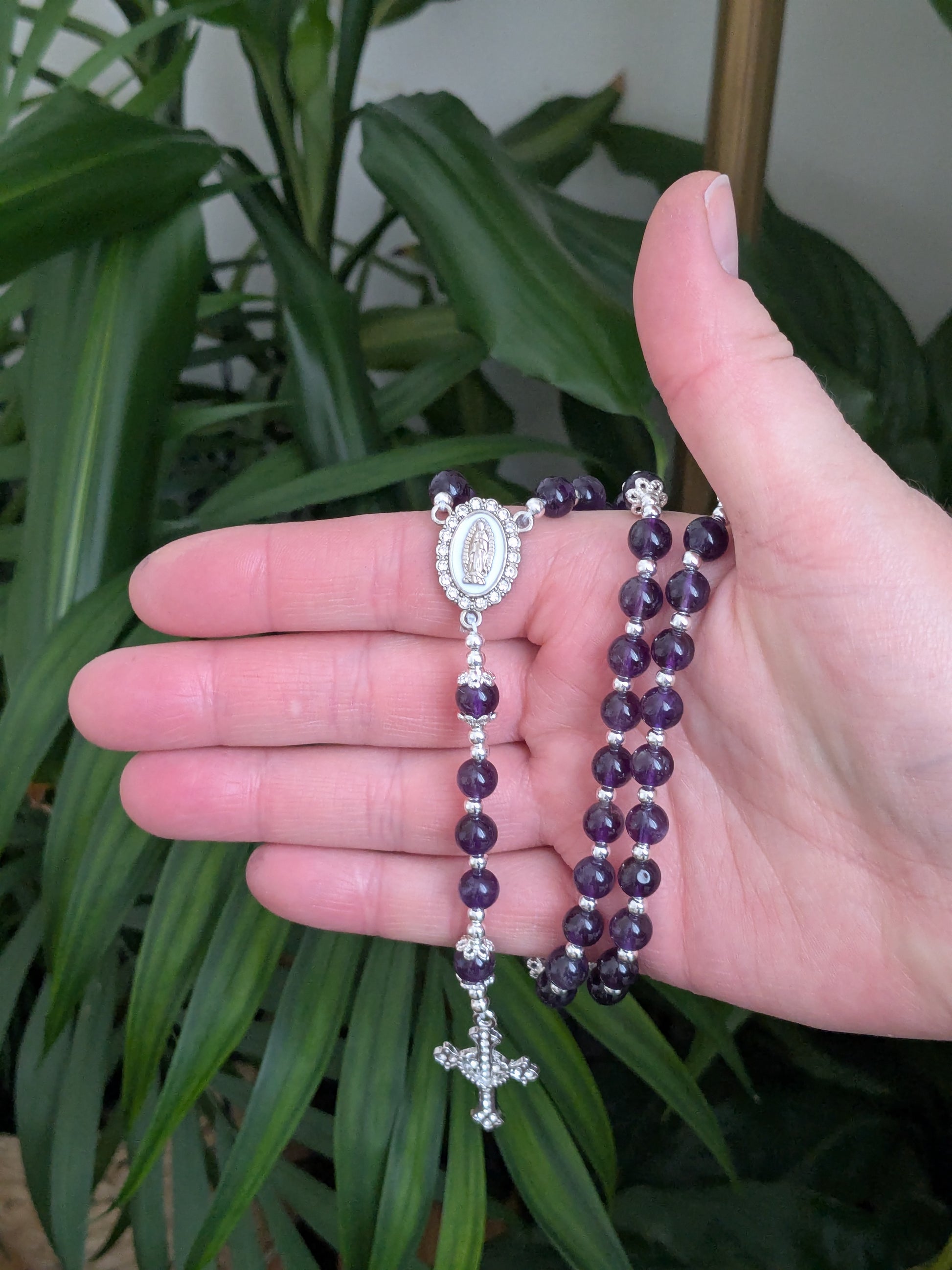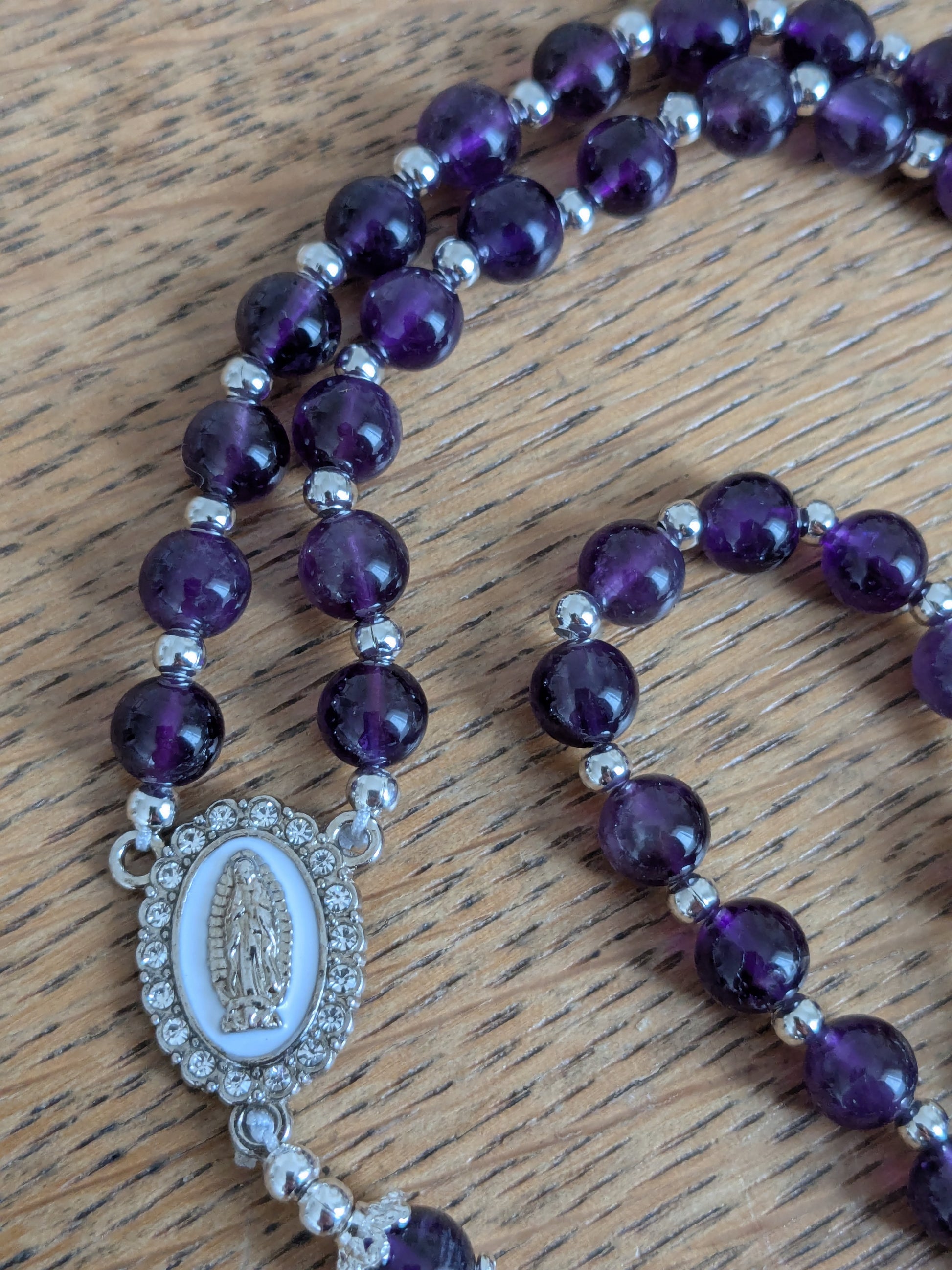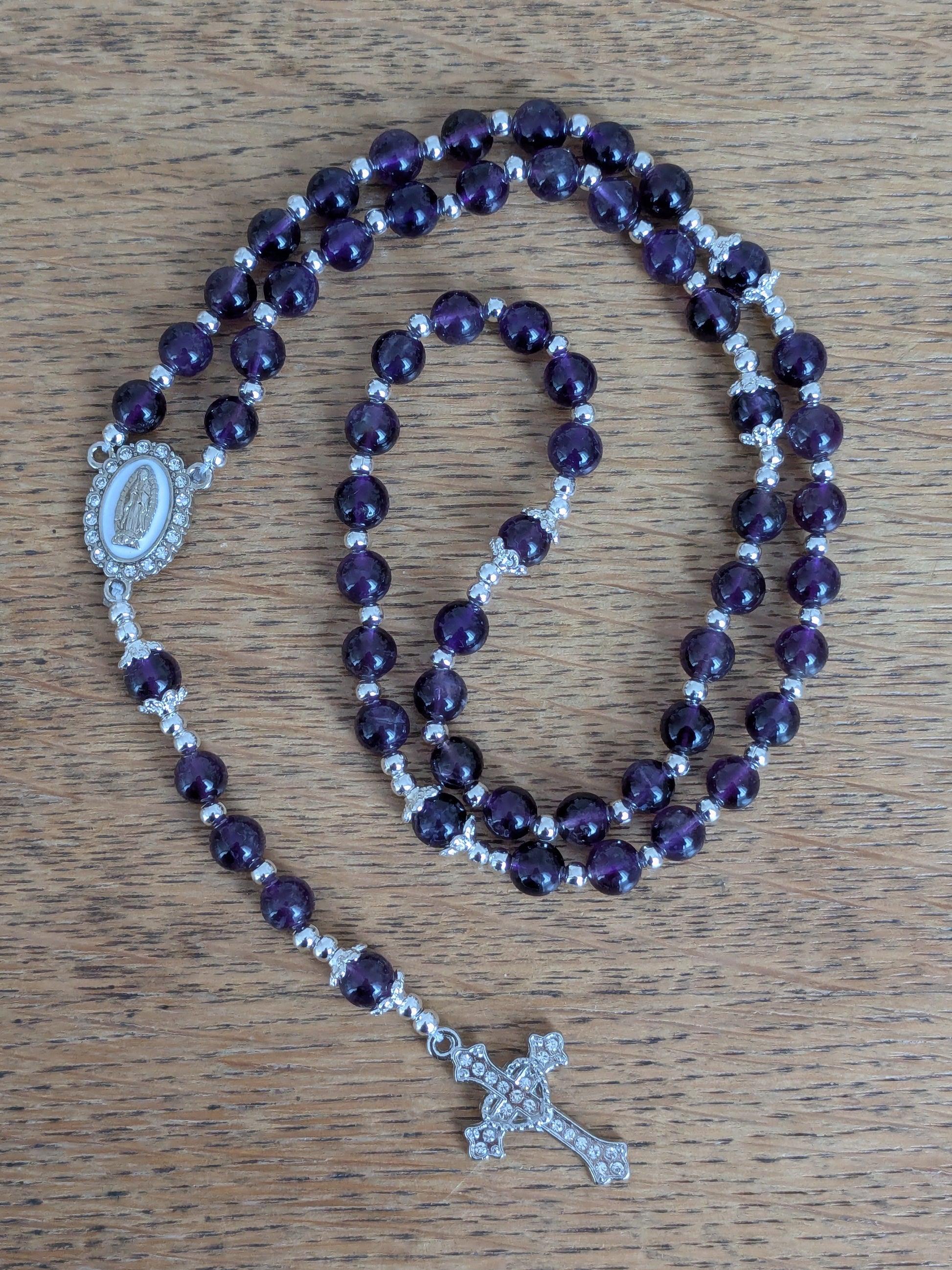 Découvrez ce magnifique chapelet catholique de confection artisanale, qui vous accompagnera dans toutes vos prières. Il est composé de véritables pierres en Améthyste d'Uruguay, d'une médaille de la Vierge Marie et d’une croix argentées.
