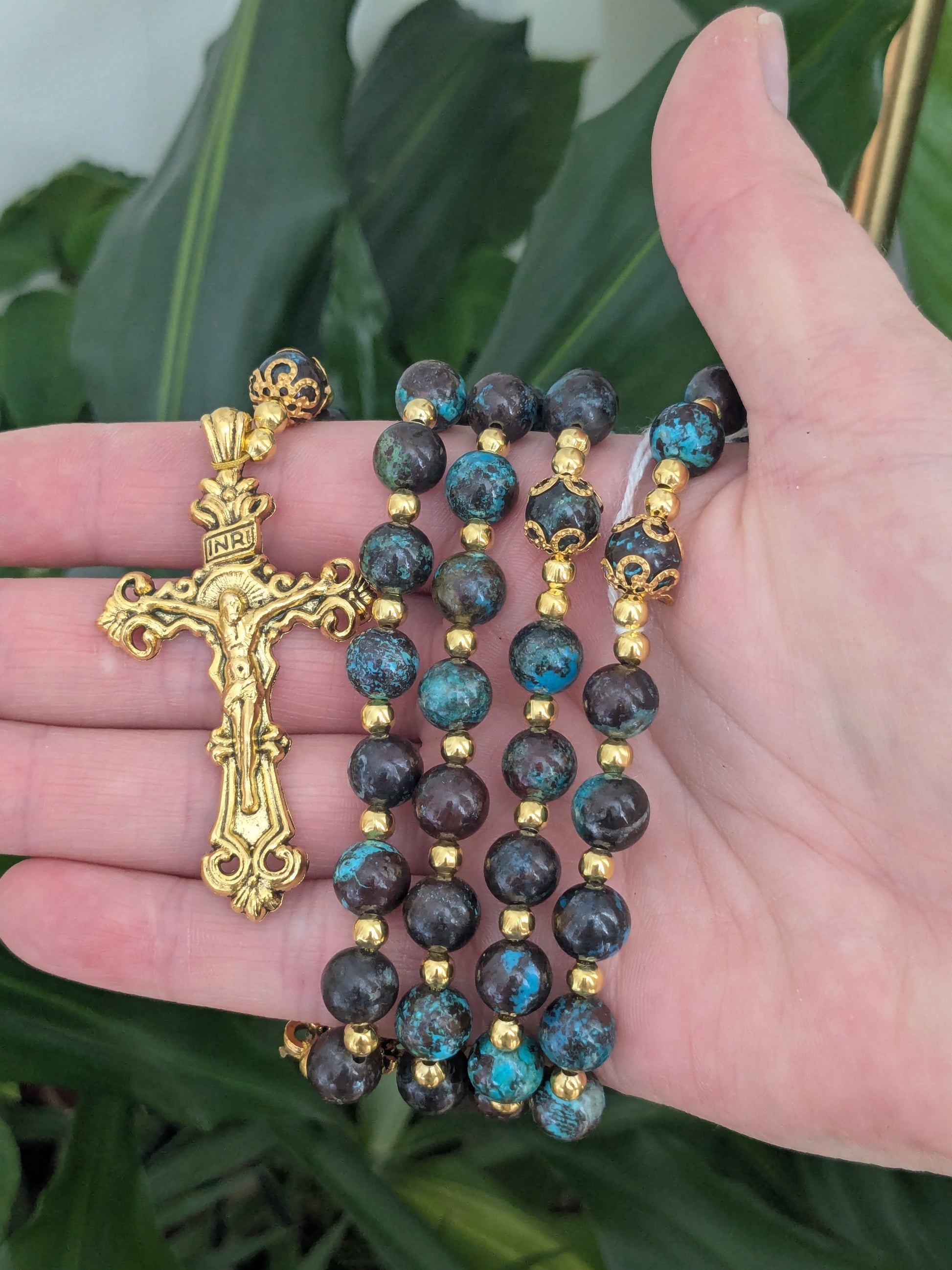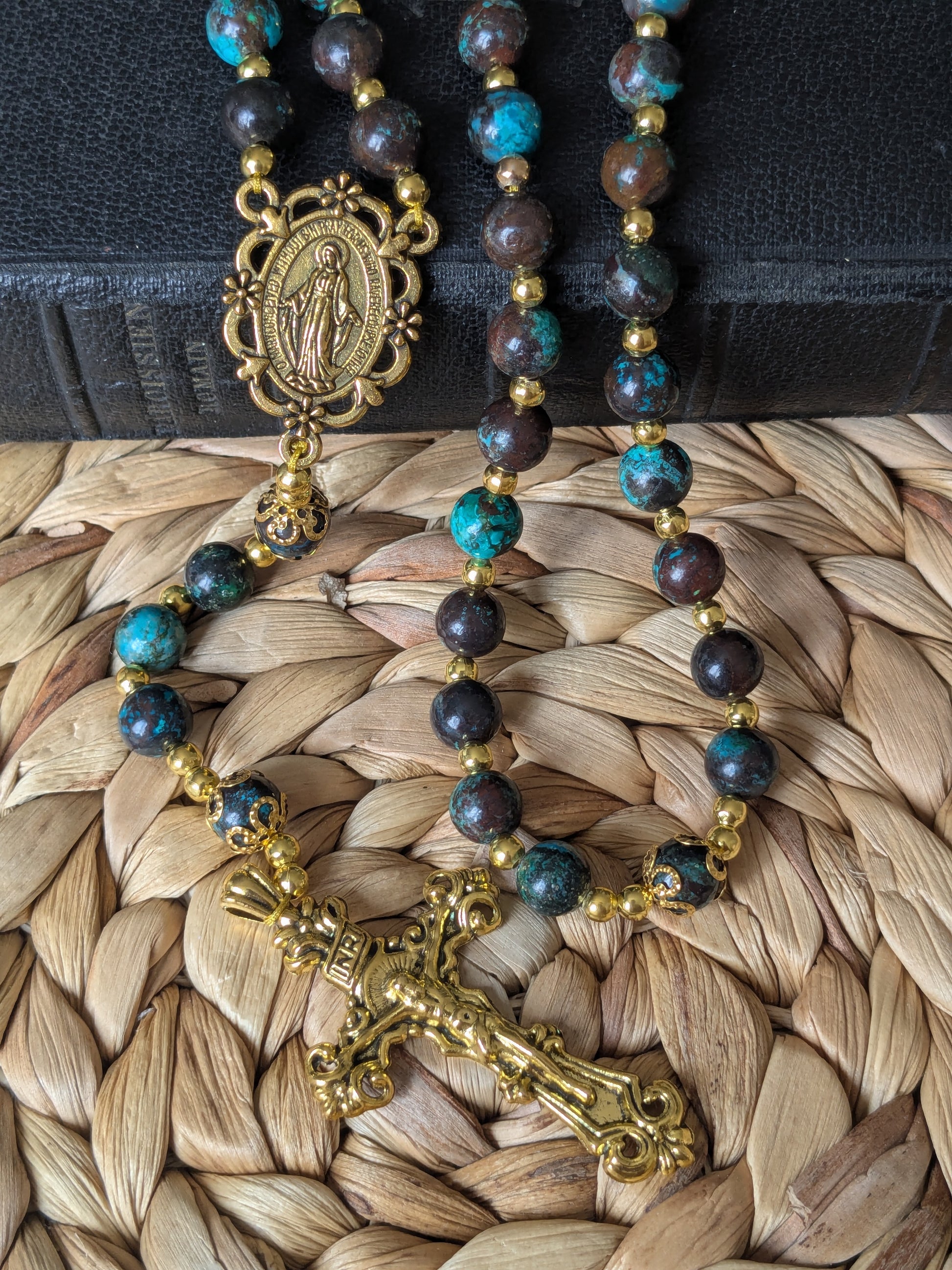 Découvrez ce magnifique chapelet catholique de confection artisanale, qui vous accompagnera dans toutes vos prières. Il est composé de véritables pierres de Chrysocolle du Congo, d'une médaille de la Vierge Marie et d'une croix catholique dorées.