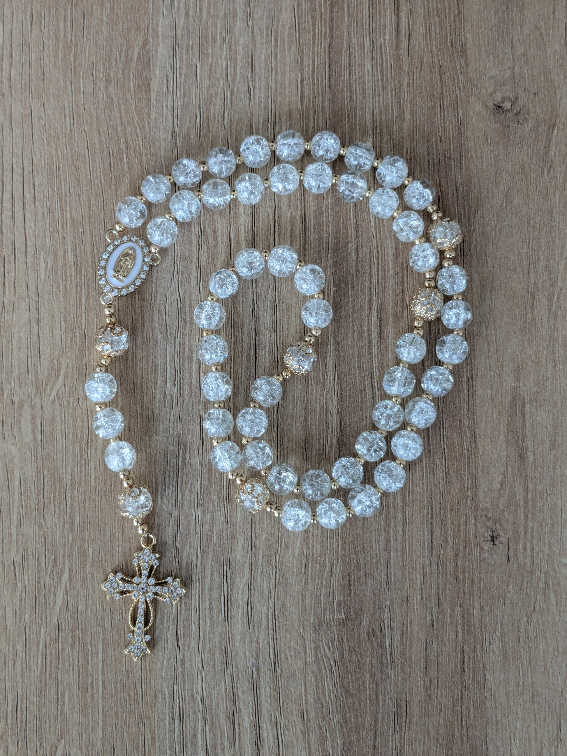 Ce chapelet catholique vous accompagnera dans toutes vos prières. Il est composé de perles en verre craquelé de couleur blanc. D’autres couleurs disponibles.