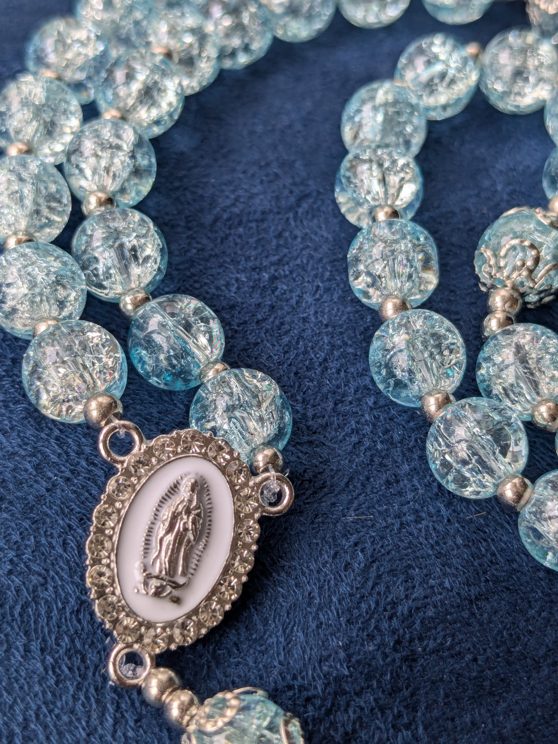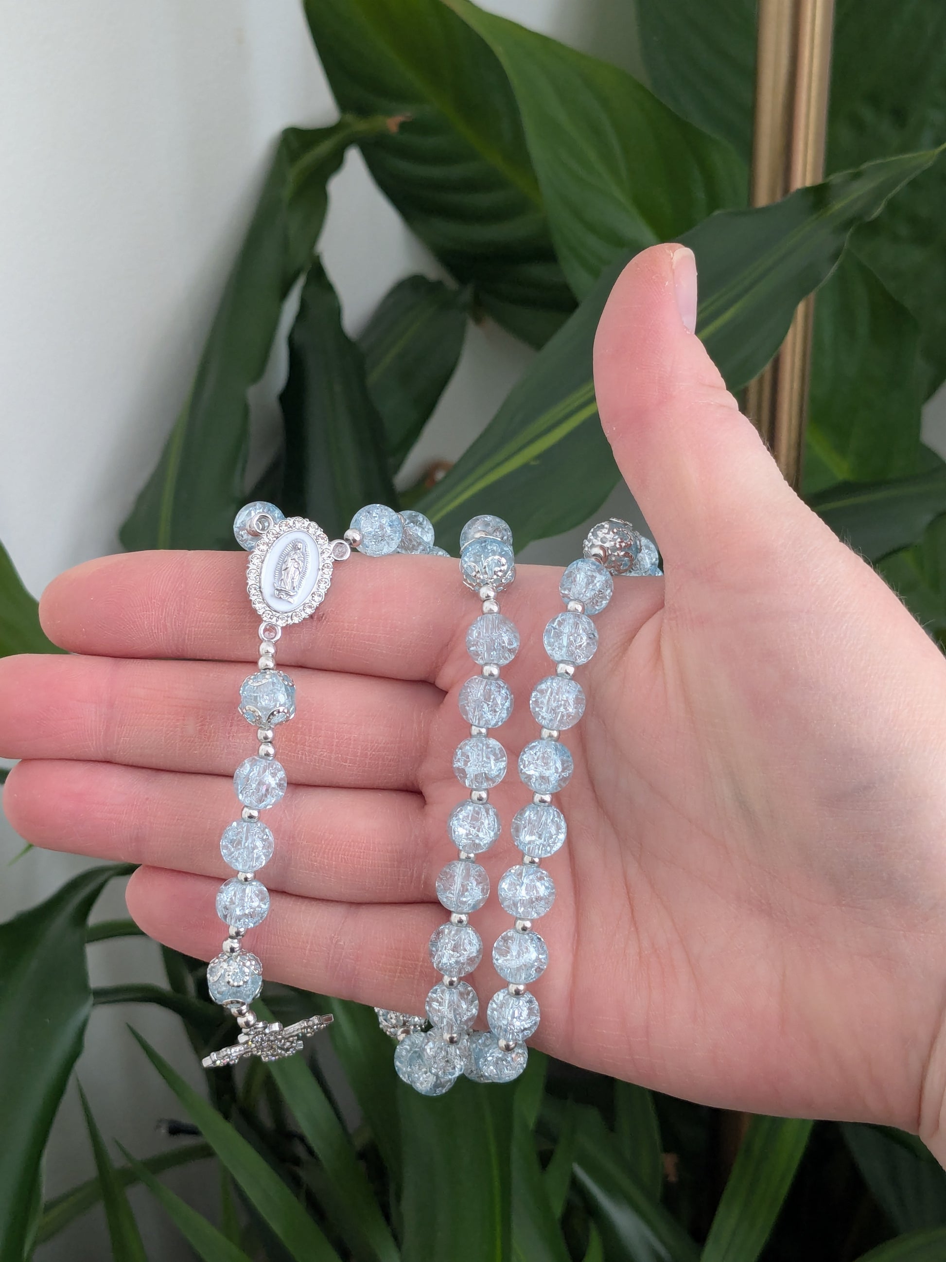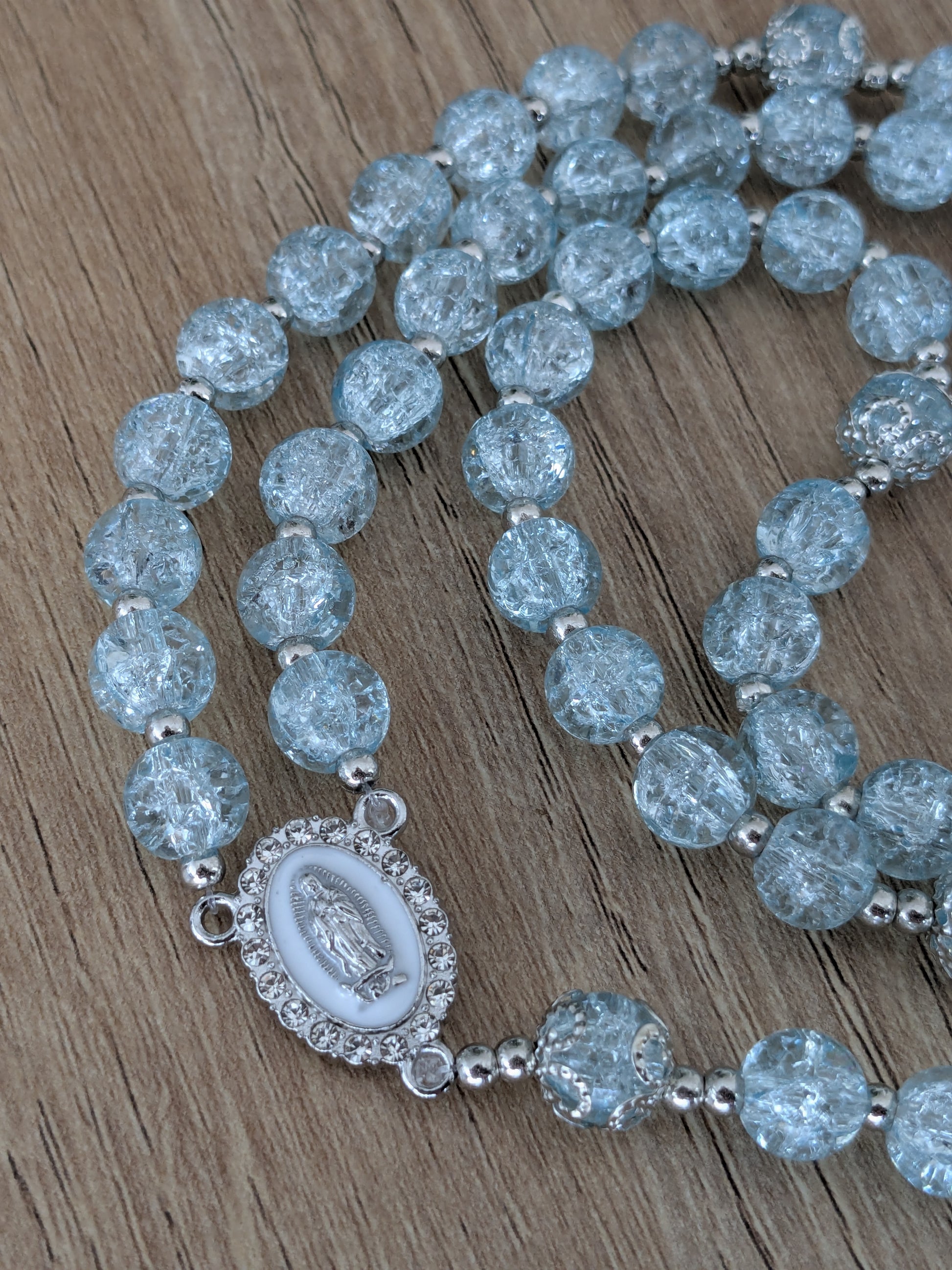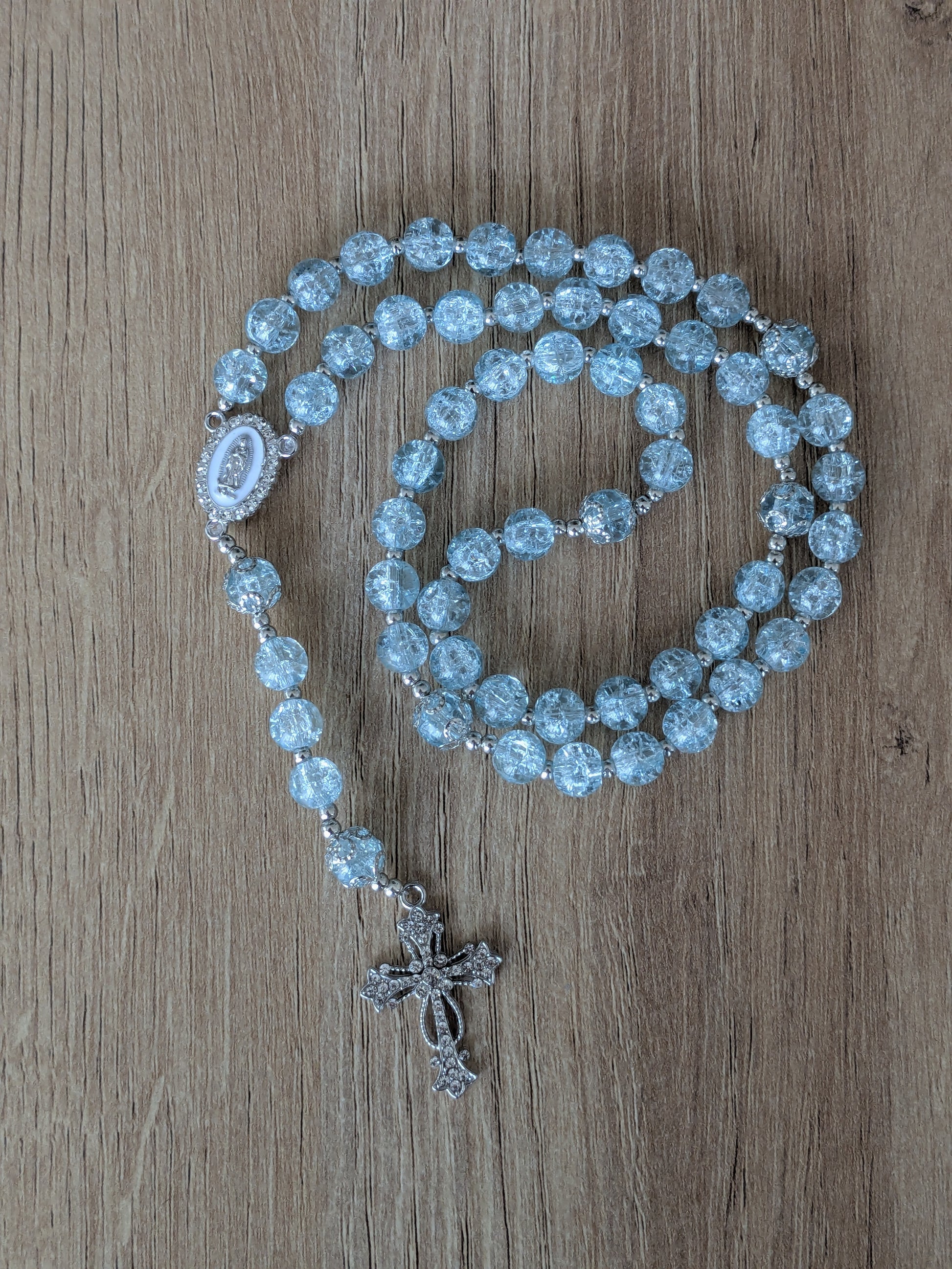 Ce chapelet catholique vous accompagnera dans toutes vos prières. Il est composé de perles en verre craquelé de couleur bleu ciel. D’autres couleurs disponibles.