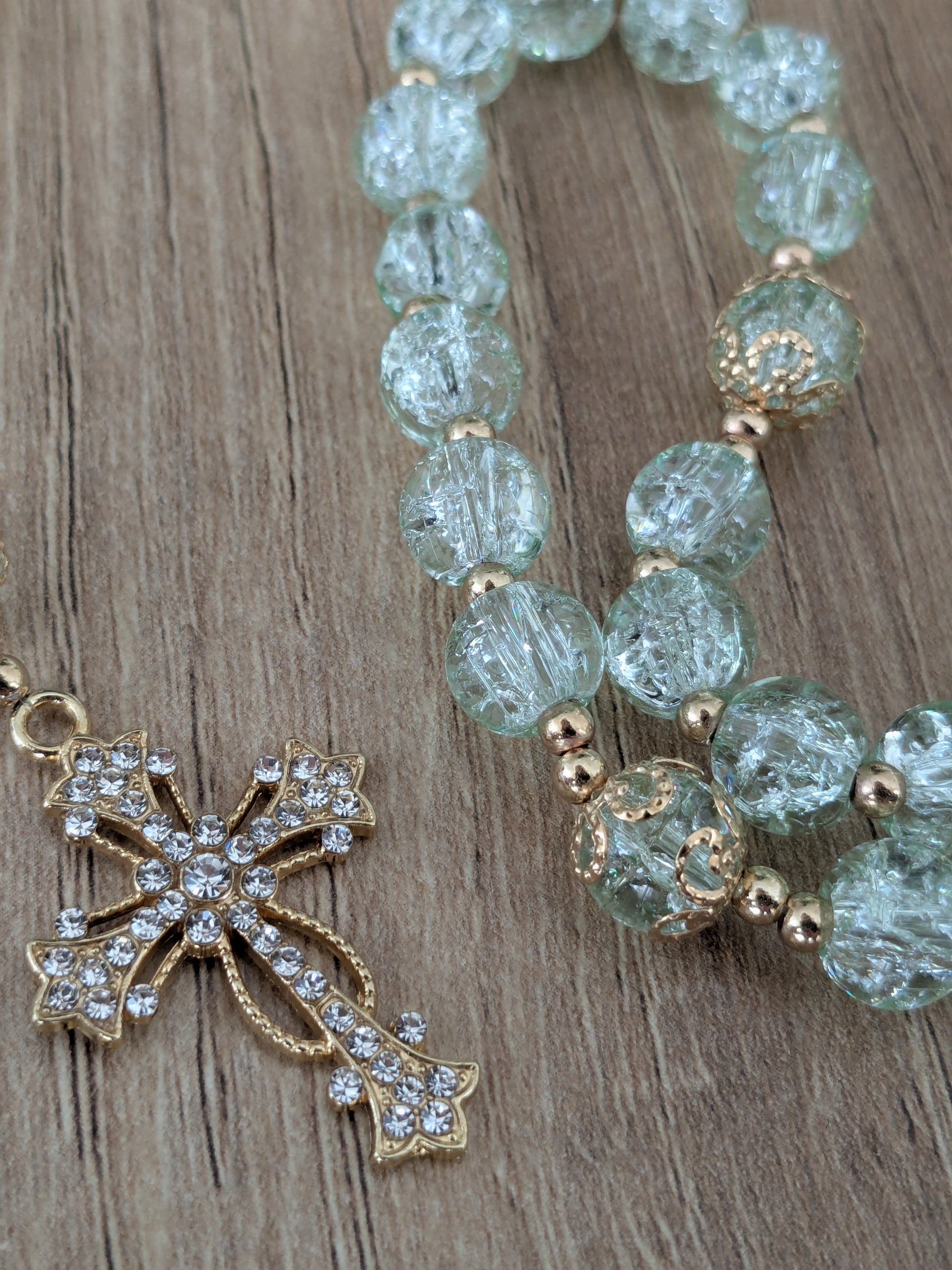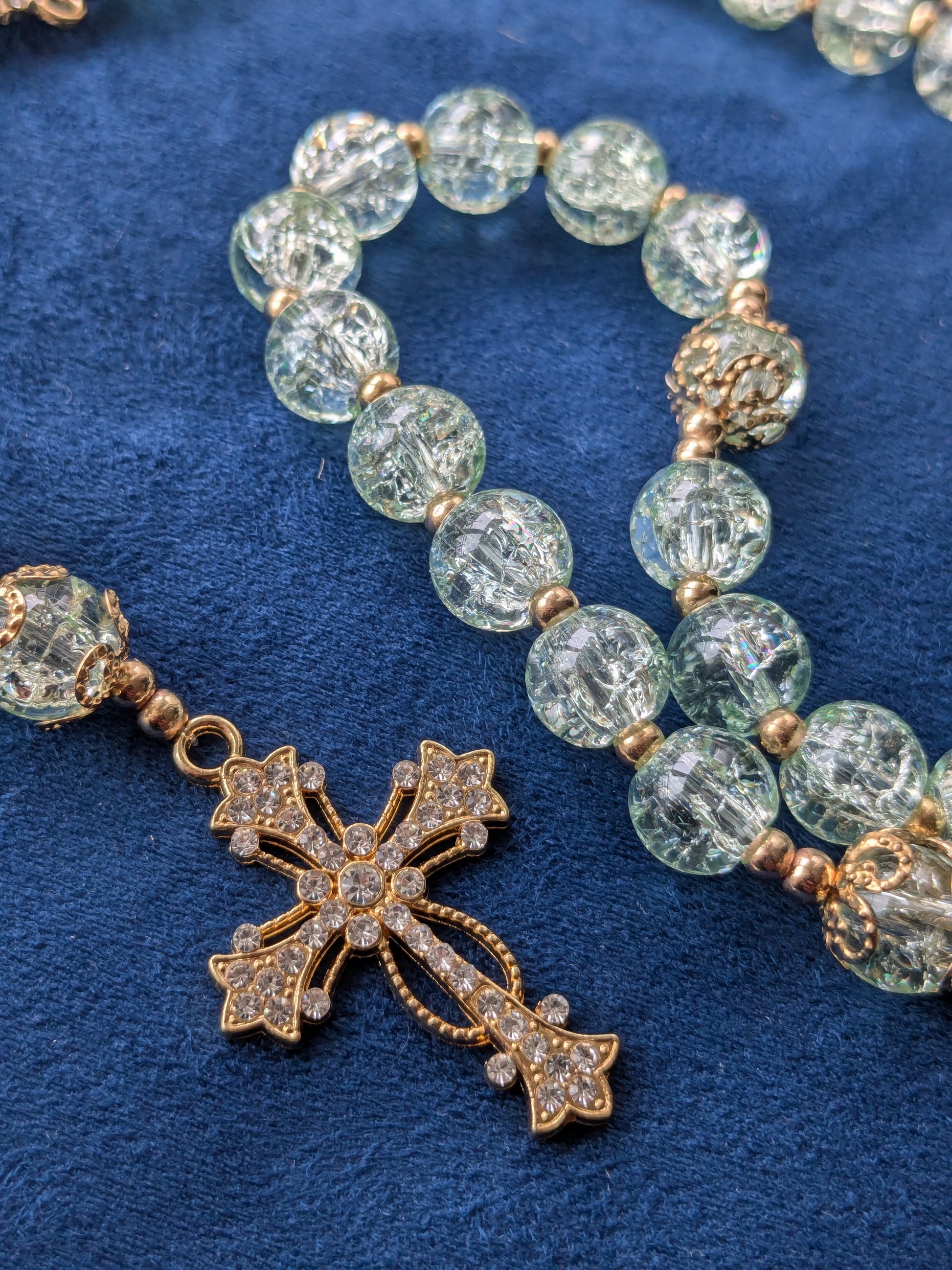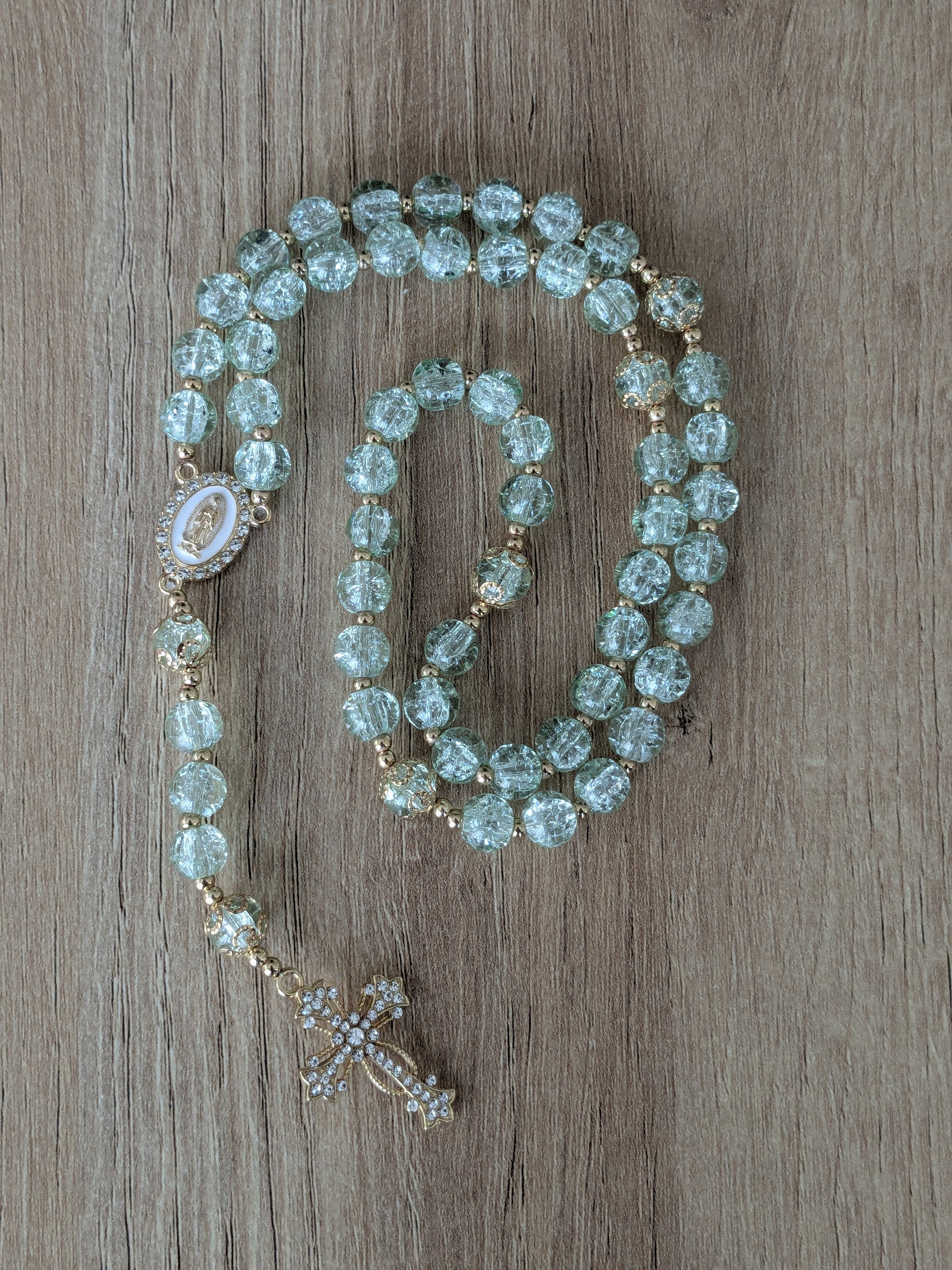 Ce chapelet catholique vous accompagnera dans toutes vos prières. Il est composé de perles en verre craquelé de couleur vert d'eau. D’autres couleurs disponibles.