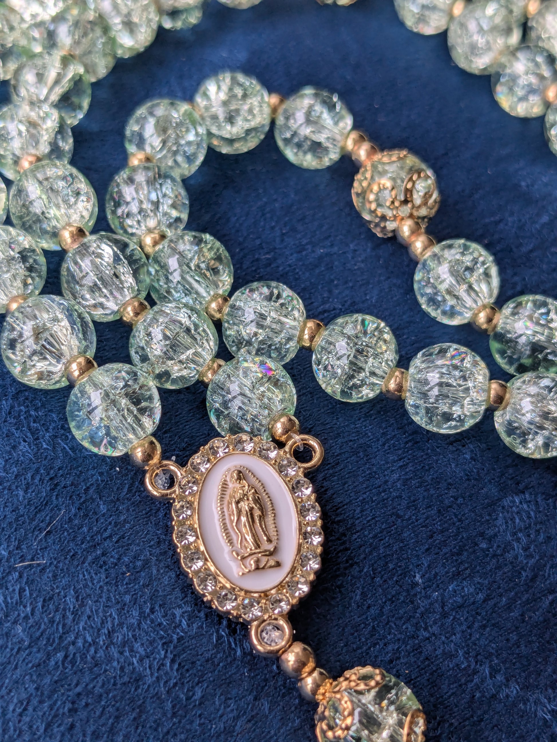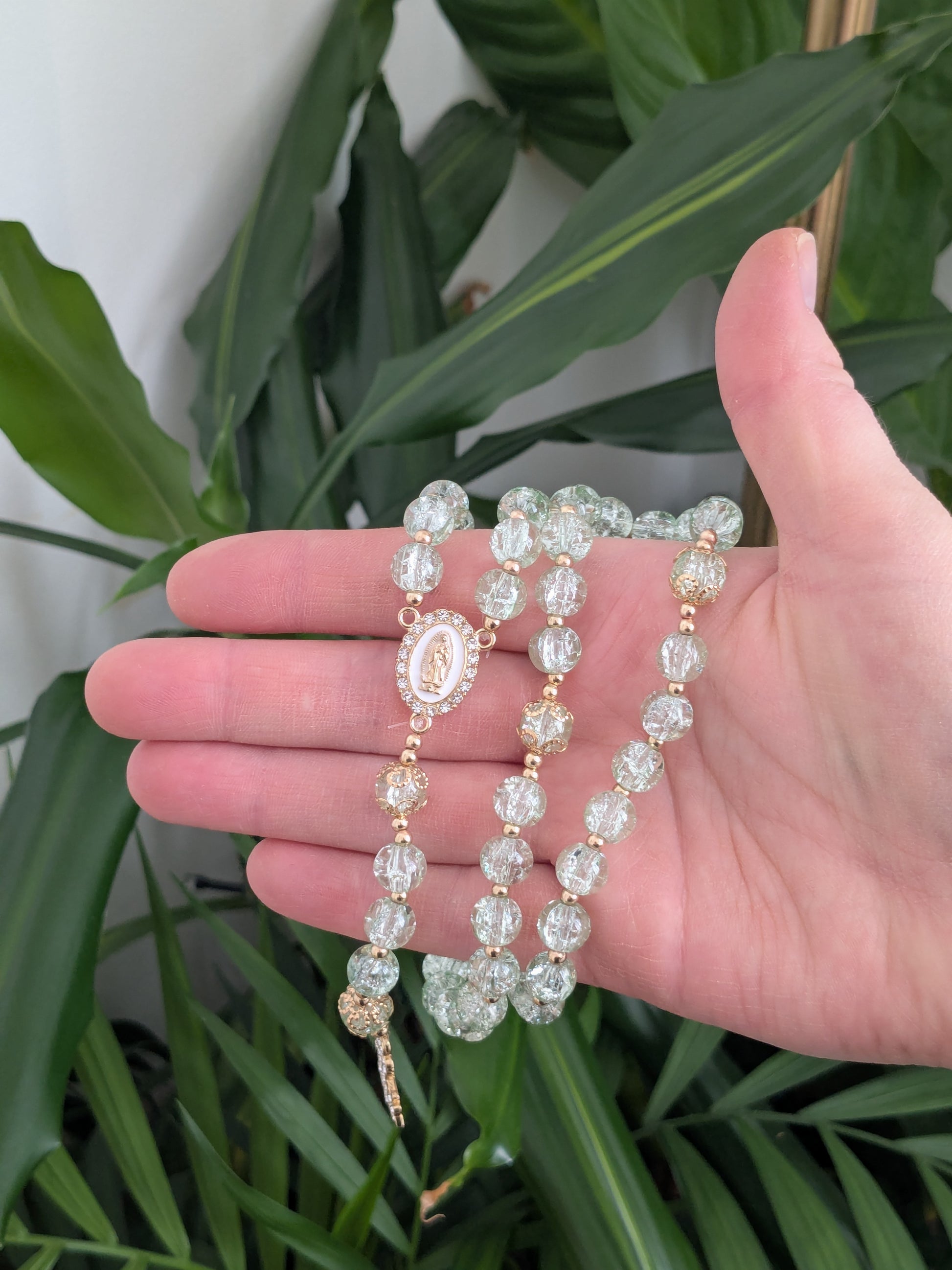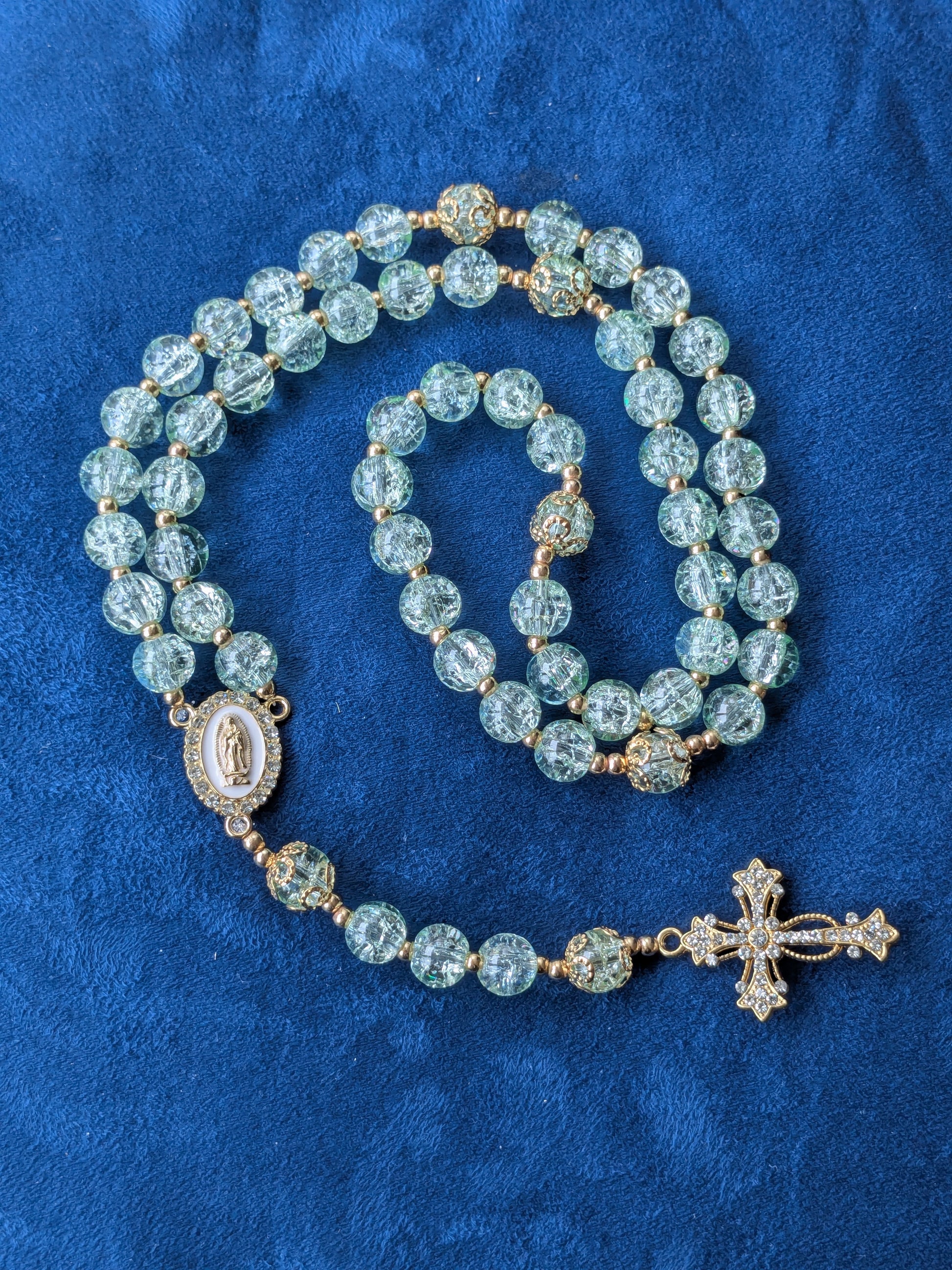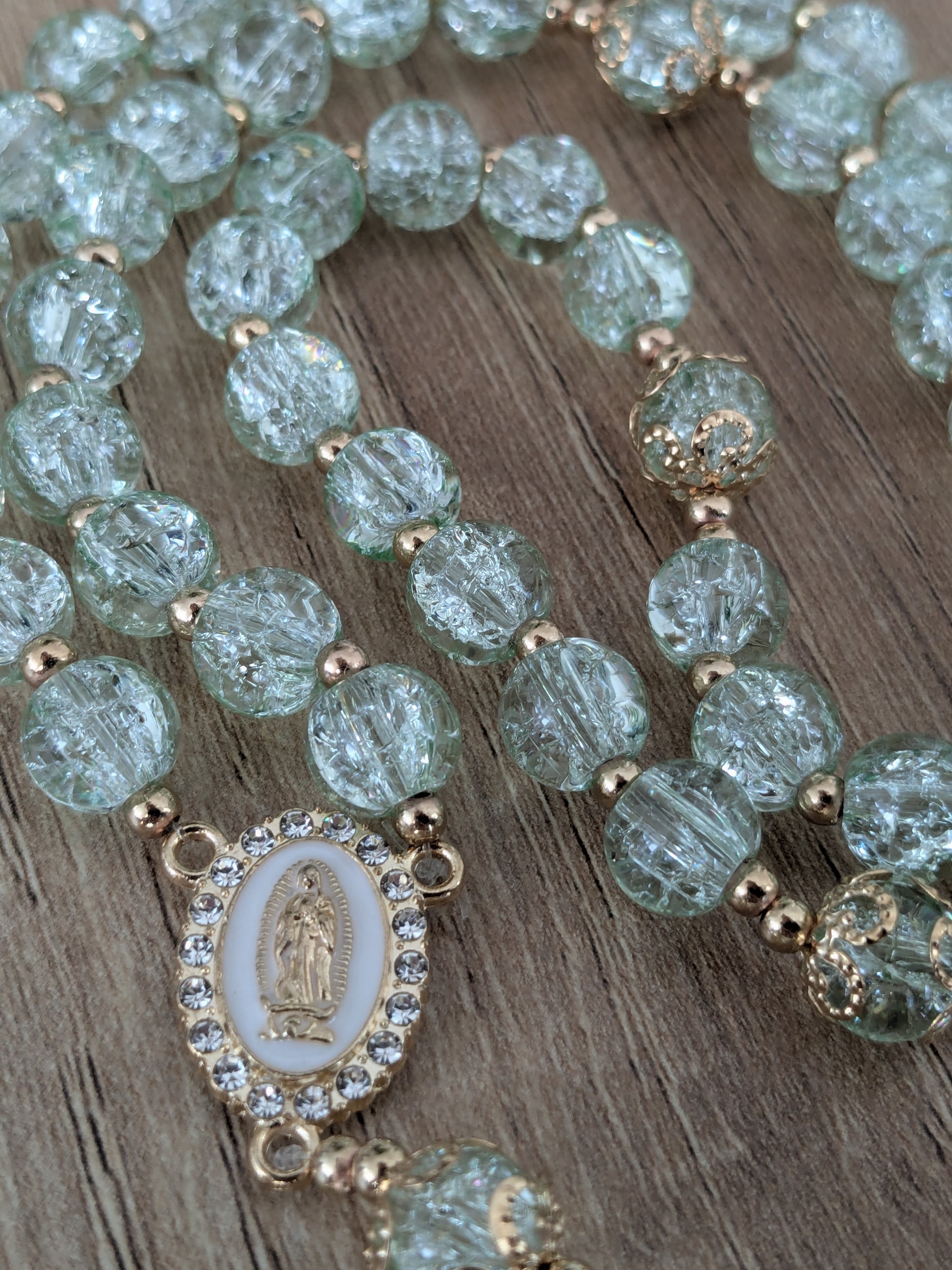 Ce chapelet catholique vous accompagnera dans toutes vos prières. Il est composé de perles en verre craquelé de couleur vert d'eau. D’autres couleurs disponibles.