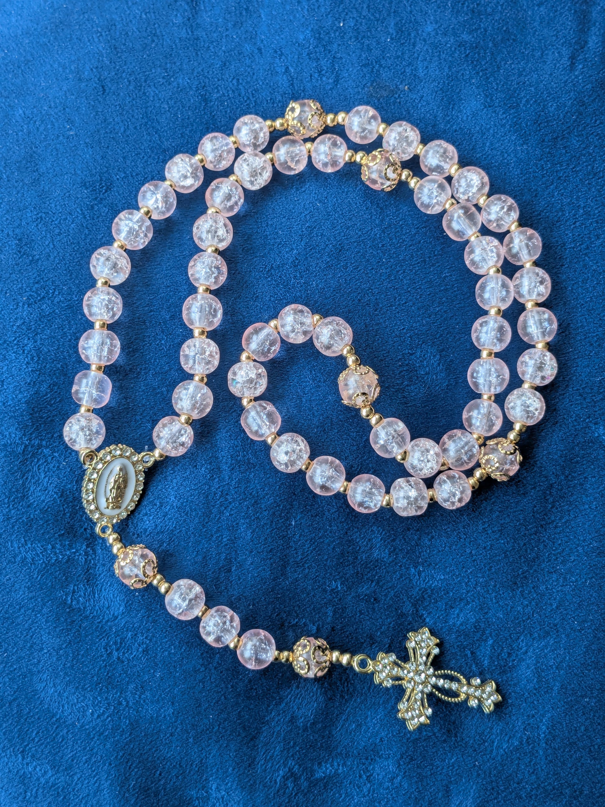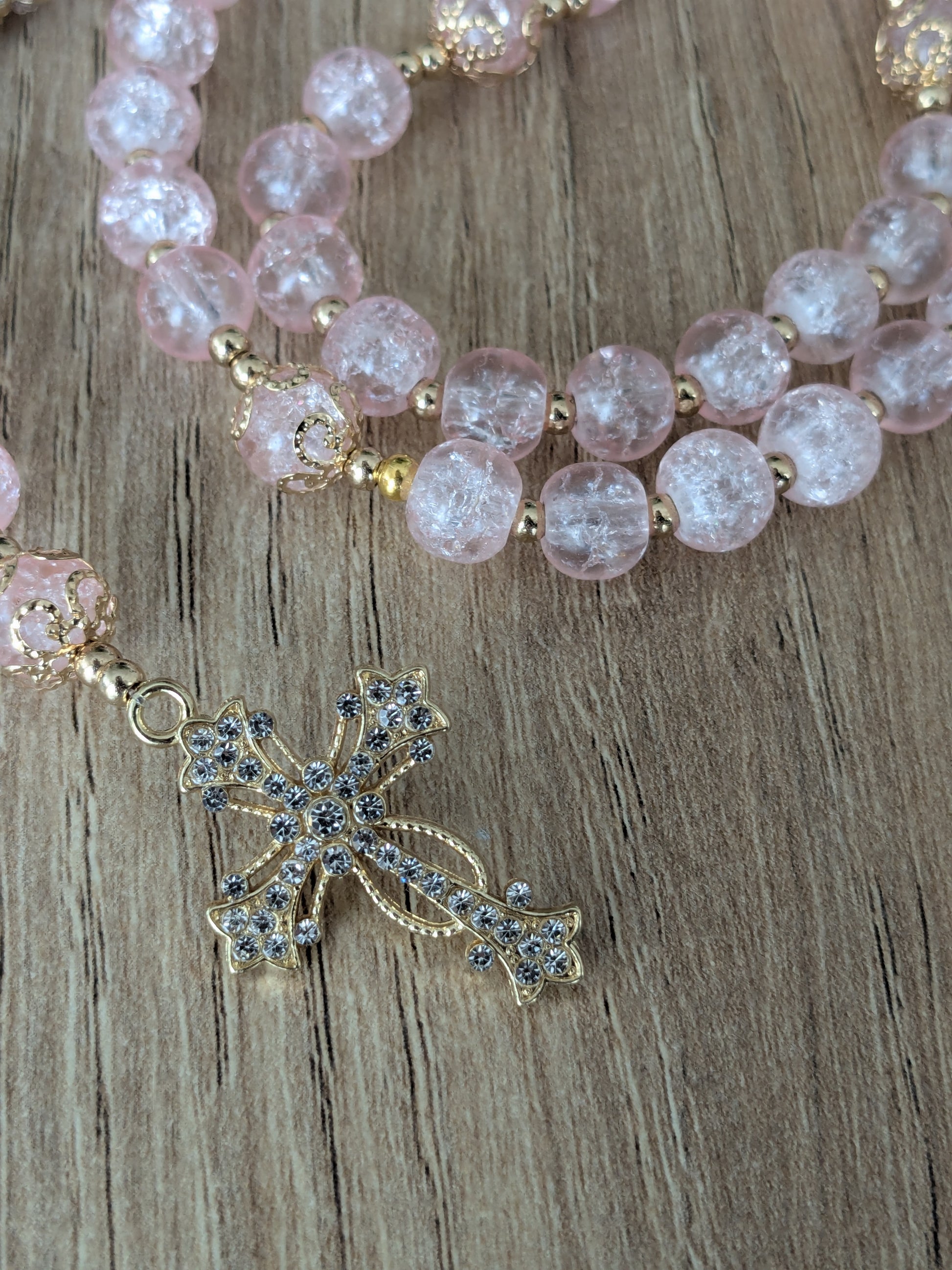 Ce chapelet catholique vous accompagnera dans toutes vos prières. Il est composé de perles en verre craquelé de couleur rose clair. D’autres couleurs disponibles.