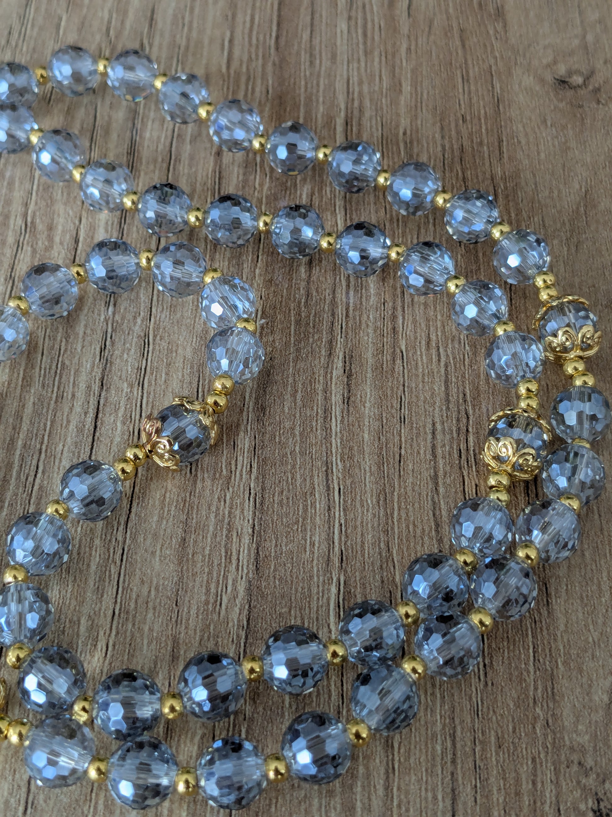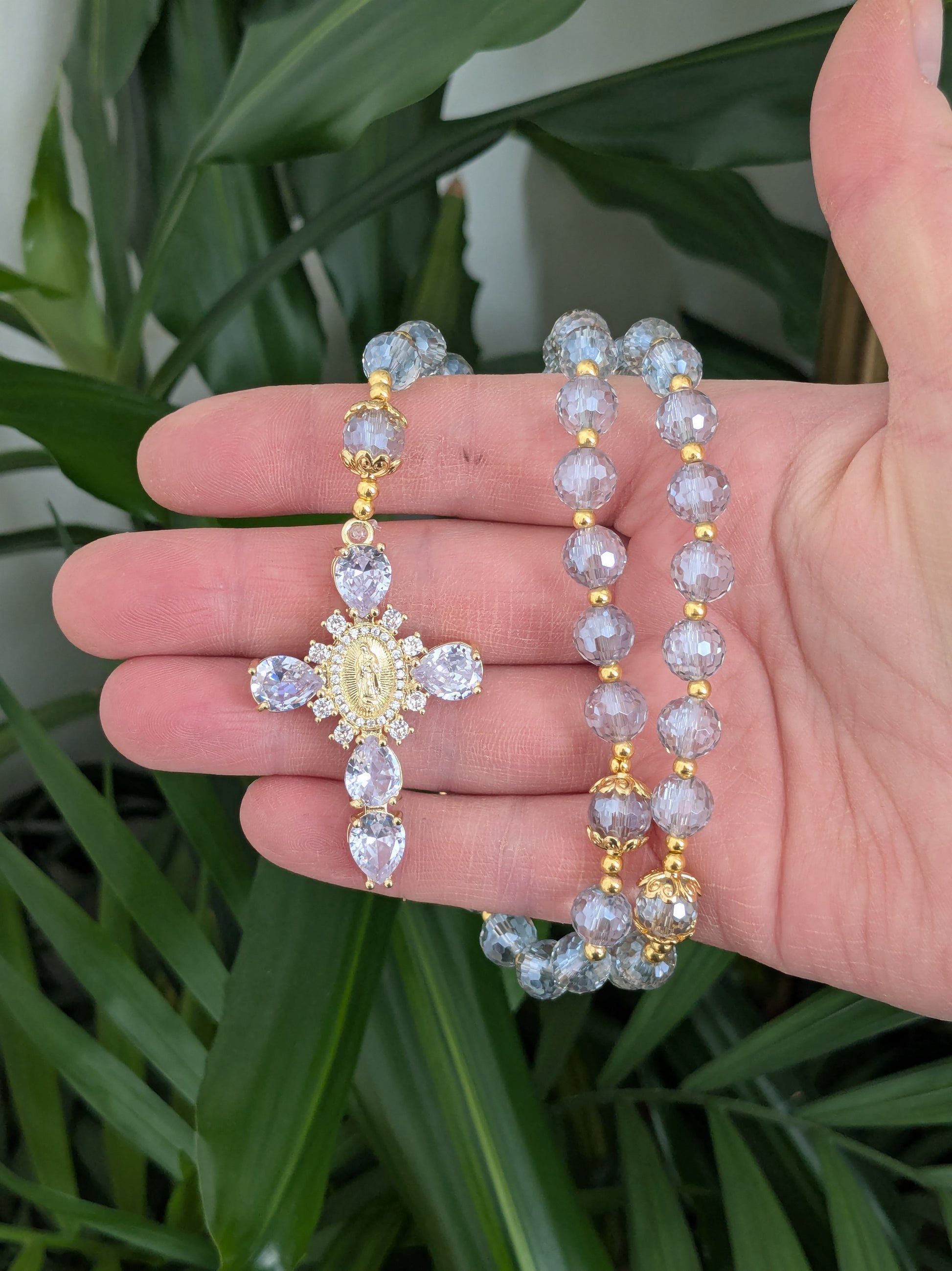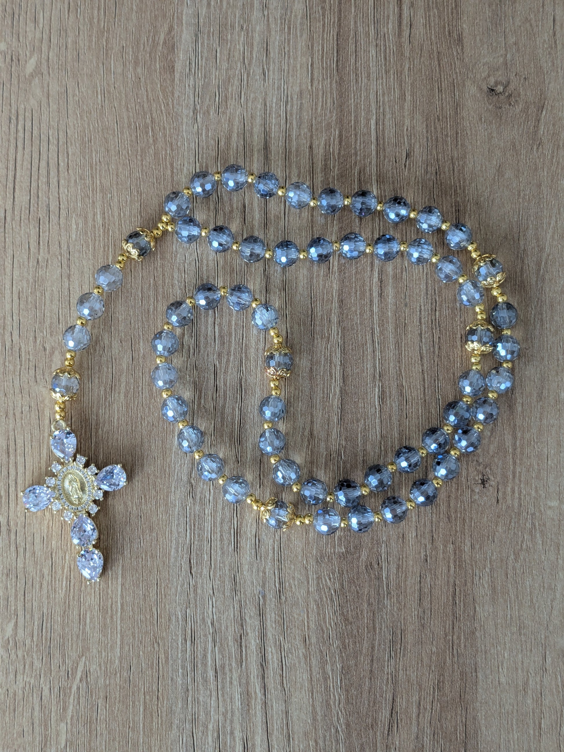 Ce chapelet catholique vous accompagnera dans toutes vos prières. Il est composé de perles facettées en verre de couleur bleu glacier.