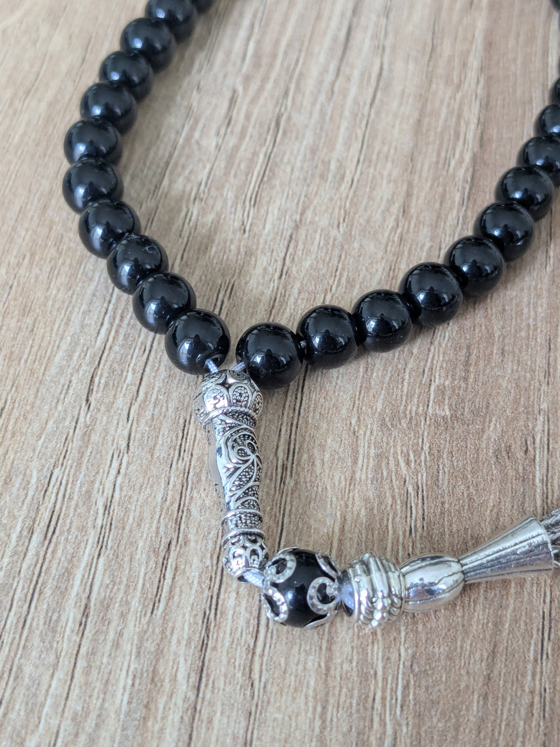 Misbaha de confection artisanale, qui vous accompagnera dans toutes vos prières. Il est composé de 33 perles en verre.