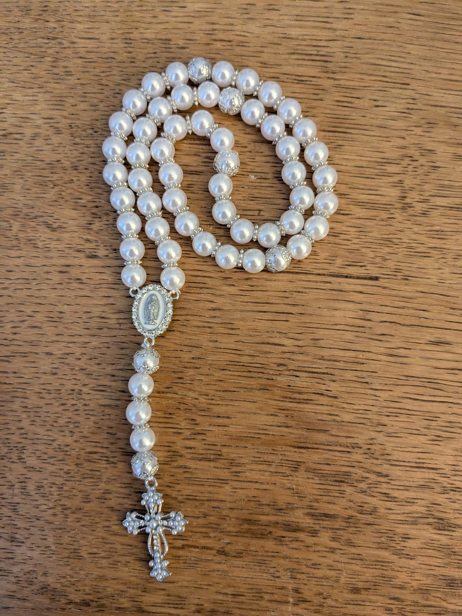 Chapelet catholique qui vous accompagnera dans toutes vos prières. Il est composé de perles en plastique imitation perle naturelle blanche et argenté.