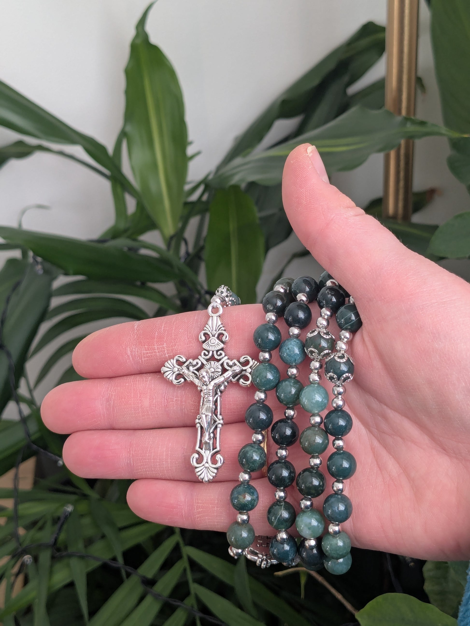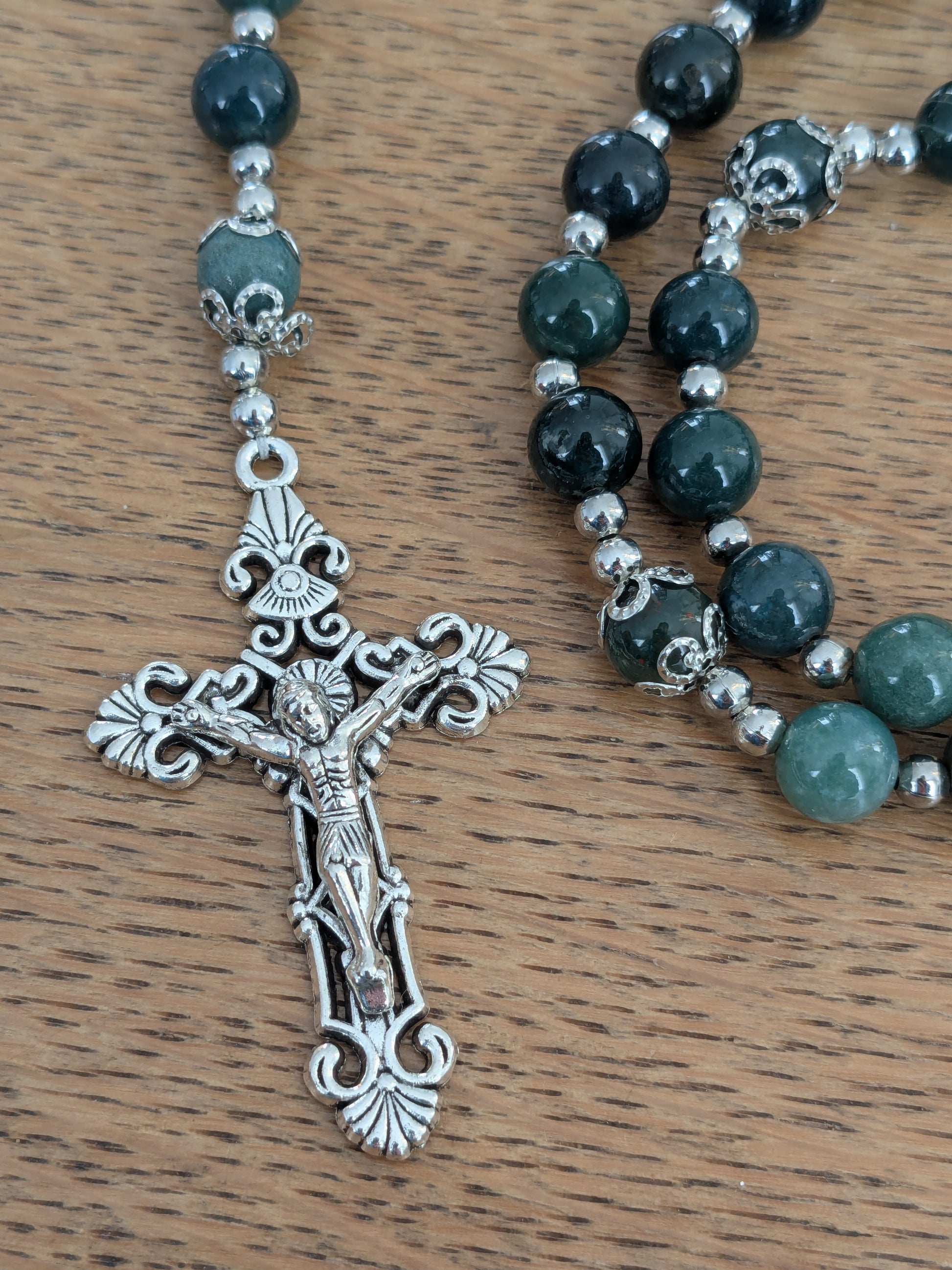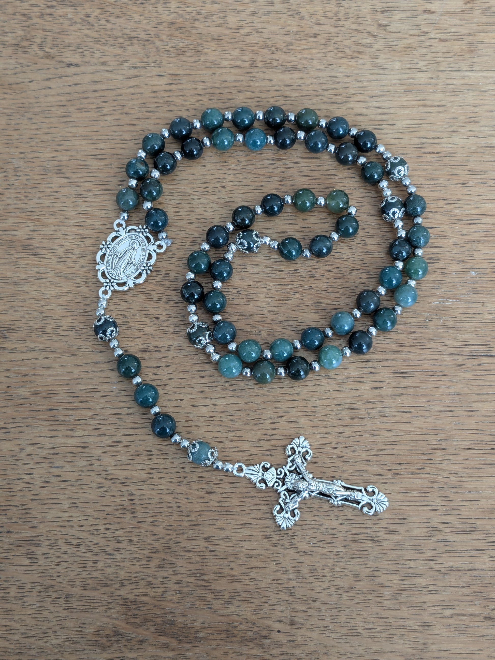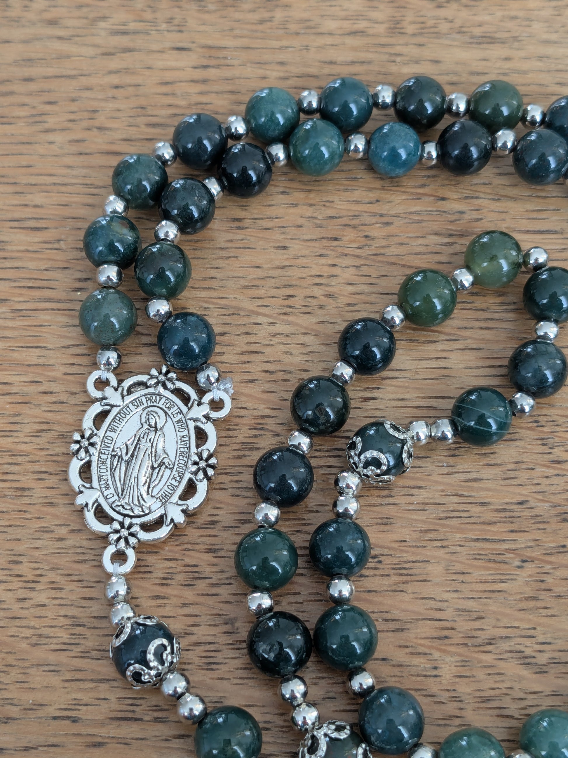 Découvrez ce magnifique chapelet catholique de confection artisanale, qui vous accompagnera dans toutes vos prières. Il est composé de véritables pierres en Agate mousse, d'une médaille de la Vierge Marie et d'une croix catholique argentées.