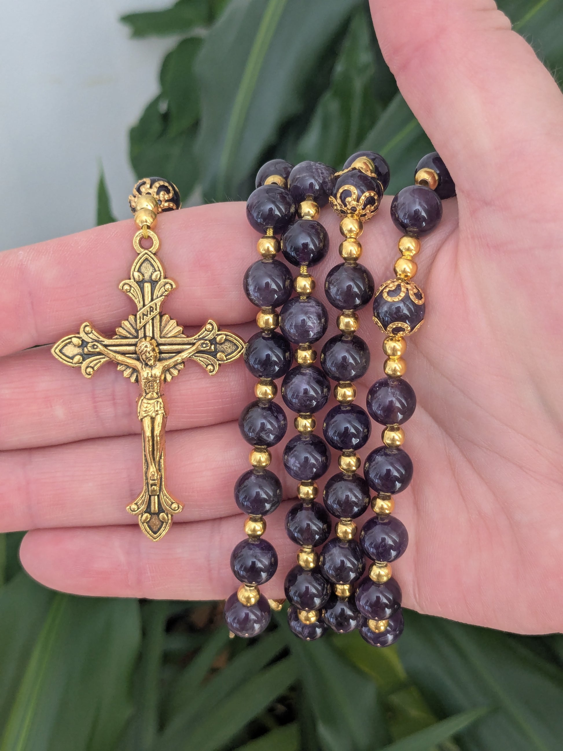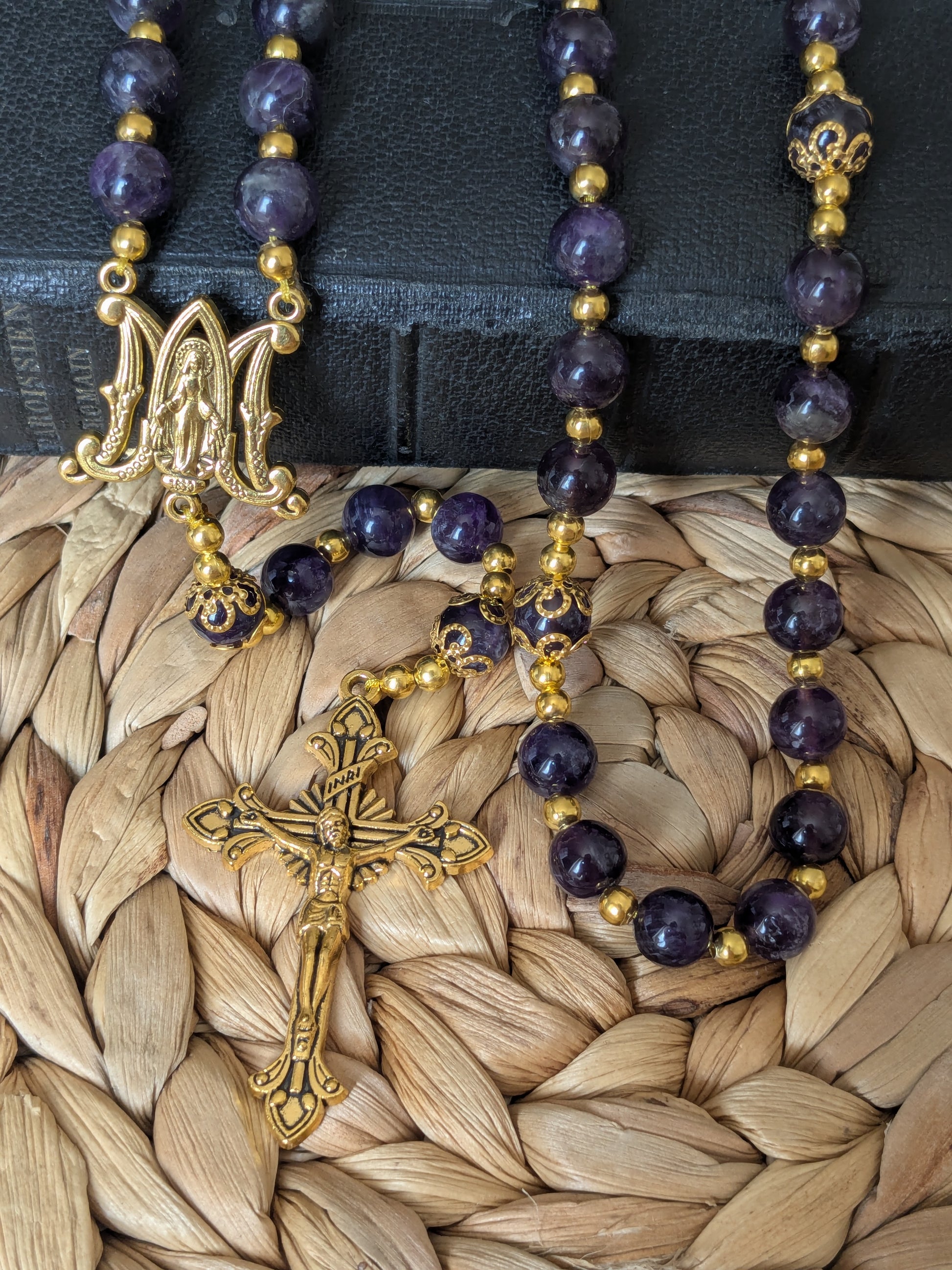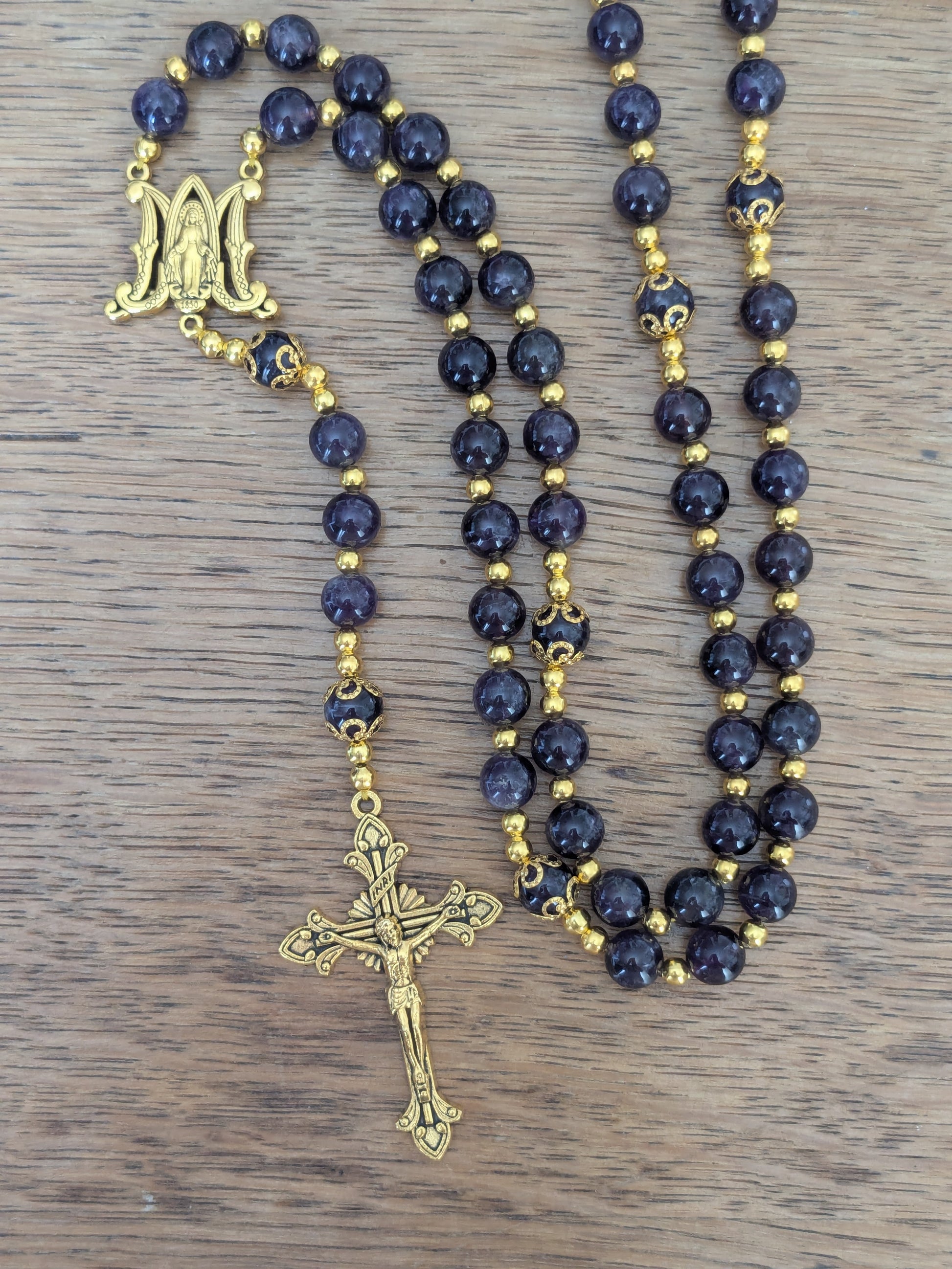 Découvrez ce magnifique chapelet catholique de confection artisanale, qui vous accompagnera dans toutes vos prières. Il est composé de véritables pierres de Rhodonite, d'une médaille de la Vierge Marie et d'une croix catholique dorées.