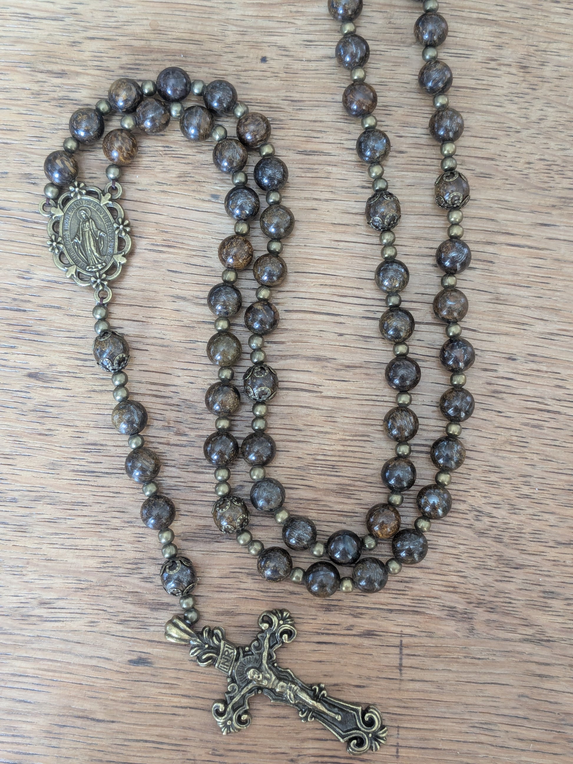 Découvrez ce magnifique chapelet catholique de confection artisanale, qui vous accompagnera dans toutes vos prières. Il est composé de véritables pierres en Bronzite, d'une médaille de la Vierge Marie et d'une croix catholique en bronze.