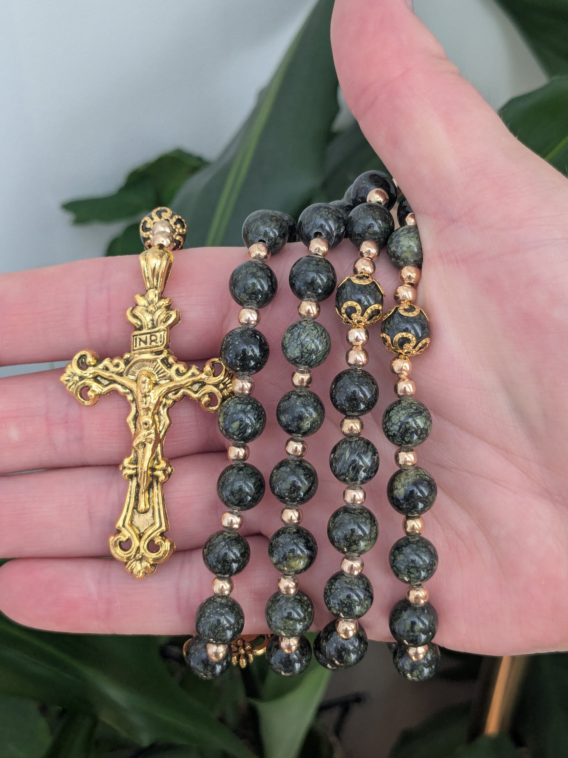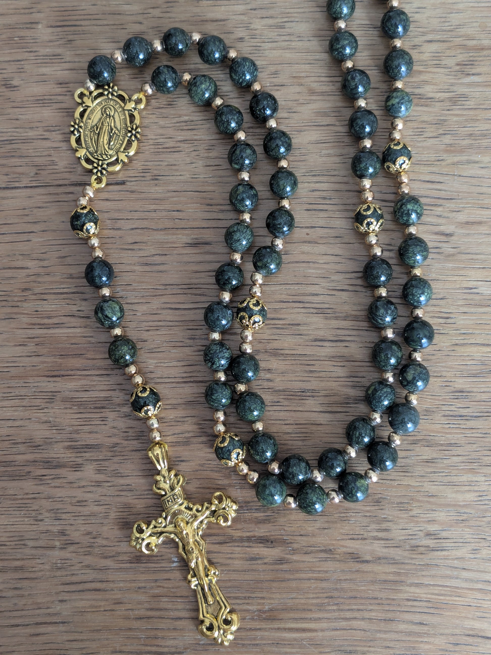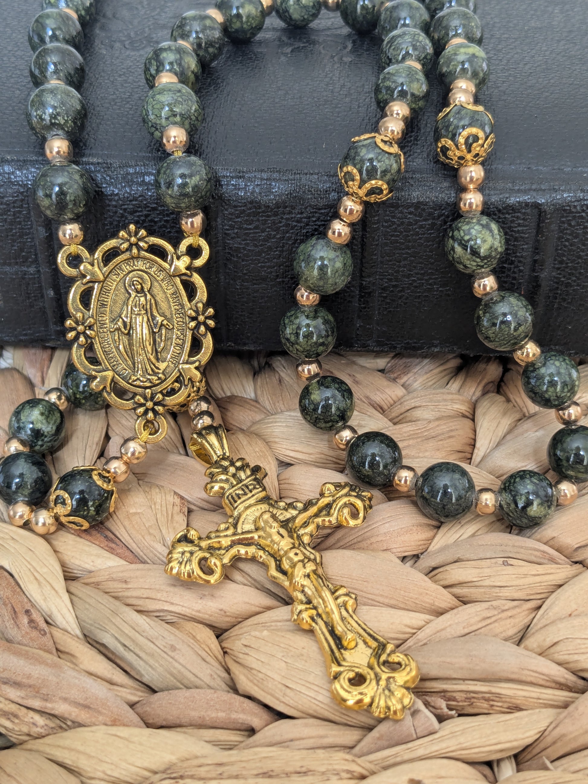Découvrez ce magnifique chapelet catholique de confection artisanale, qui vous accompagnera dans toutes vos prières. Il est composé de véritables pierres de Serpentine de Russie, d'une médaille de la Vierge Marie et d'une croix catholique dorées.