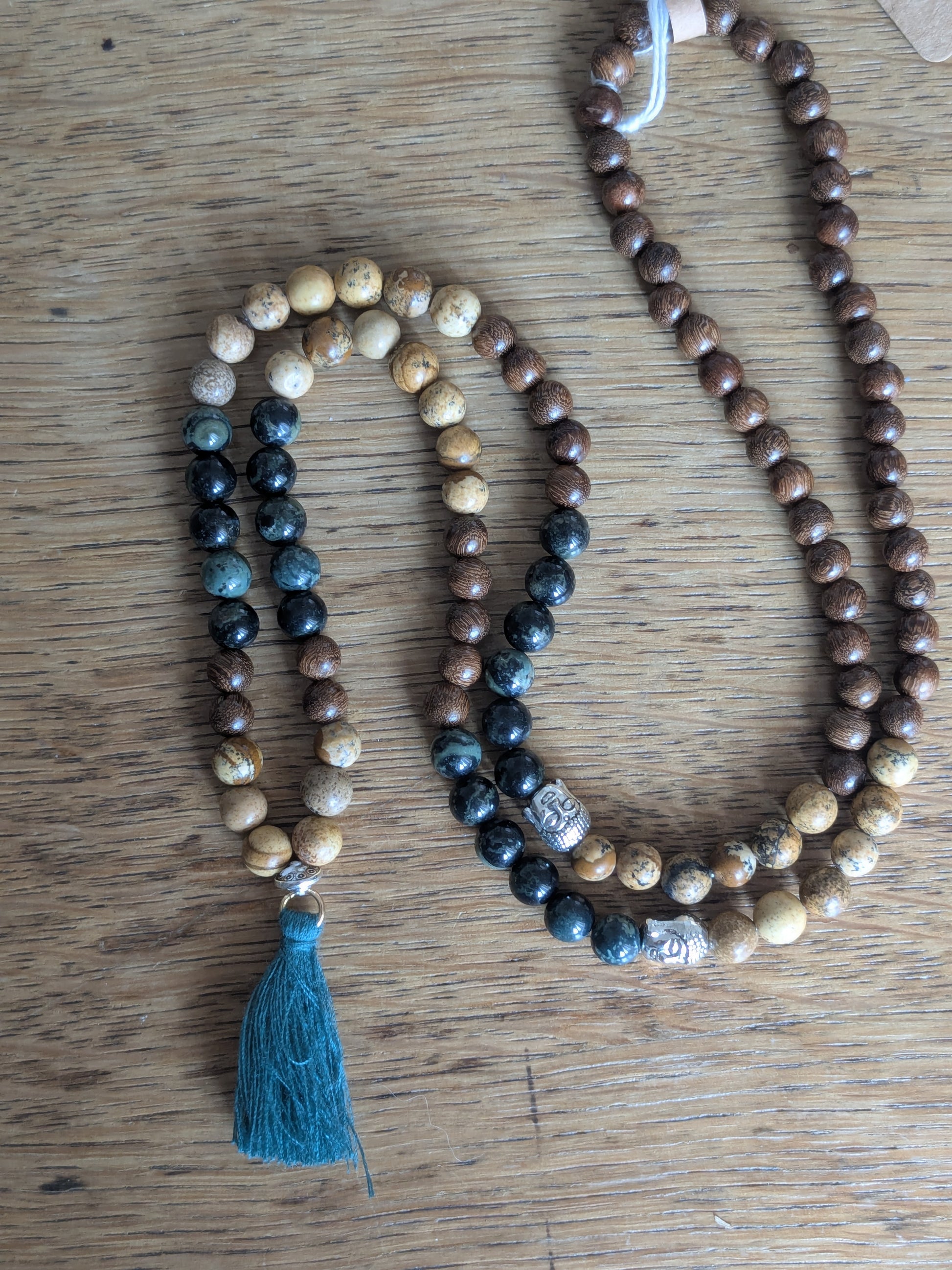 Découvrez ce magnifique mala de confection artisanale qui vous accompagnera dans toutes vos méditations. Il est composé 108 perles naturelles en Jaspe kambaba, Jaspe paysage et Bois de Santal doré. Le Jaspe kambaba ancre à la Terre, calme l’esprit et renforce la volonté pour surmonter les obstacles. Jaspe paysage : Le Jaspe paysage connecte à la nature, apaise et encourage la contemplation. Fabriqué avec amour Perles de 6mm de diamètre Longueur du mala : environ 42cm Pierres de qualité issues d’un grossiste français |