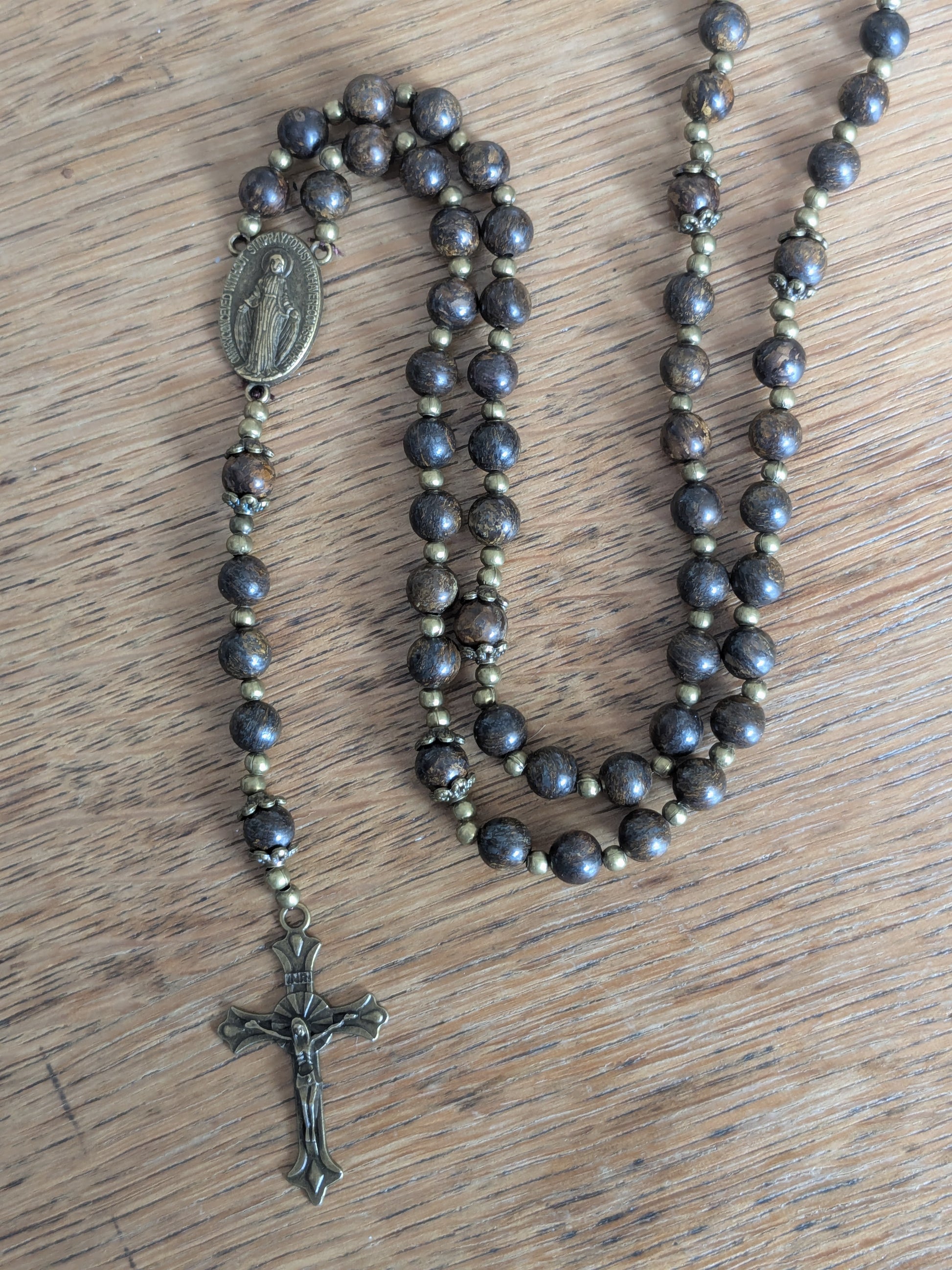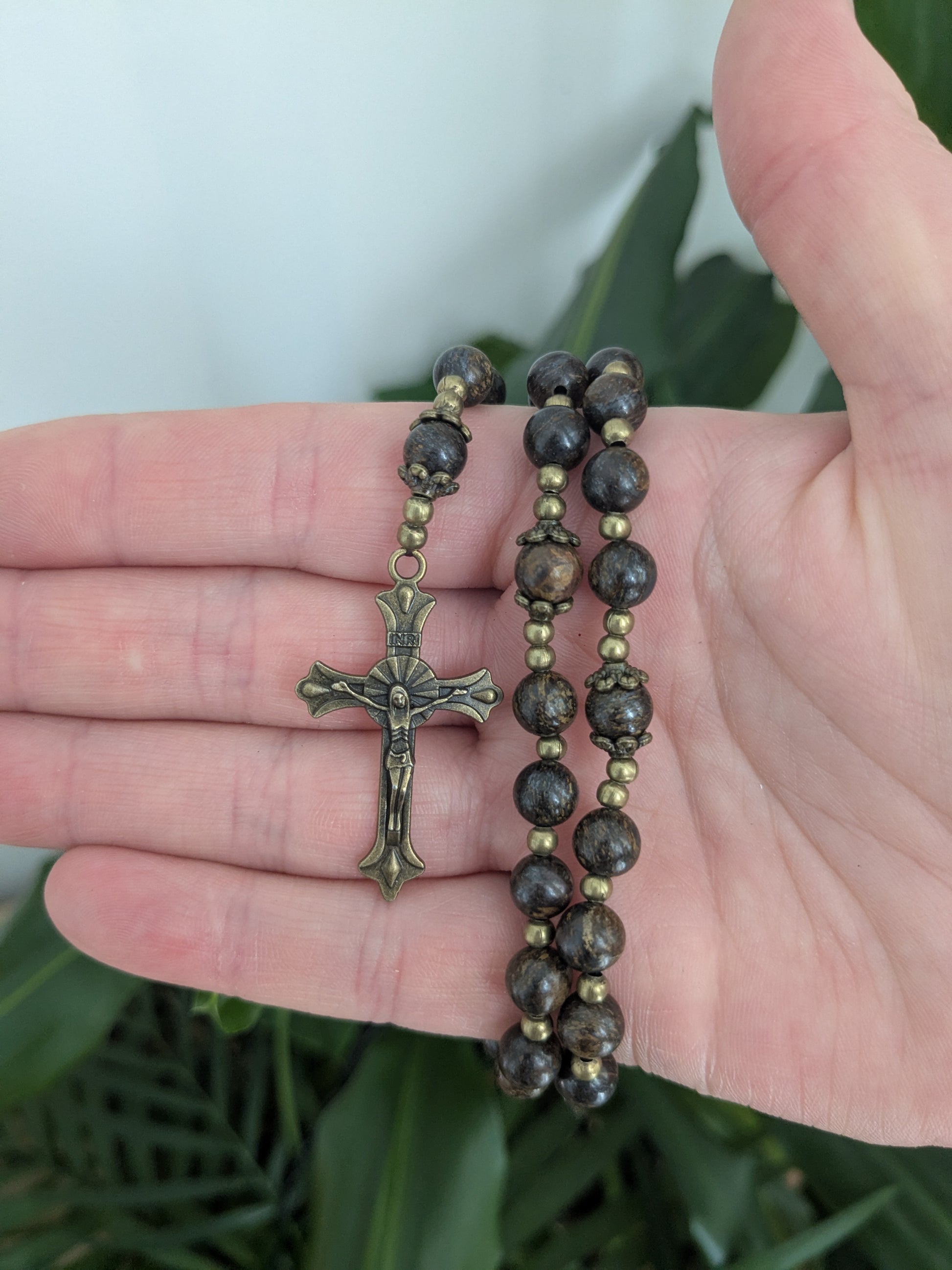 Découvrez ce magnifique chapelet catholique de confection artisanale, qui vous accompagnera dans toutes vos prières. Il est composé de véritable pierres en Bronzite, d'une médaille de la Vierge Marie et d'une croix en bronze.