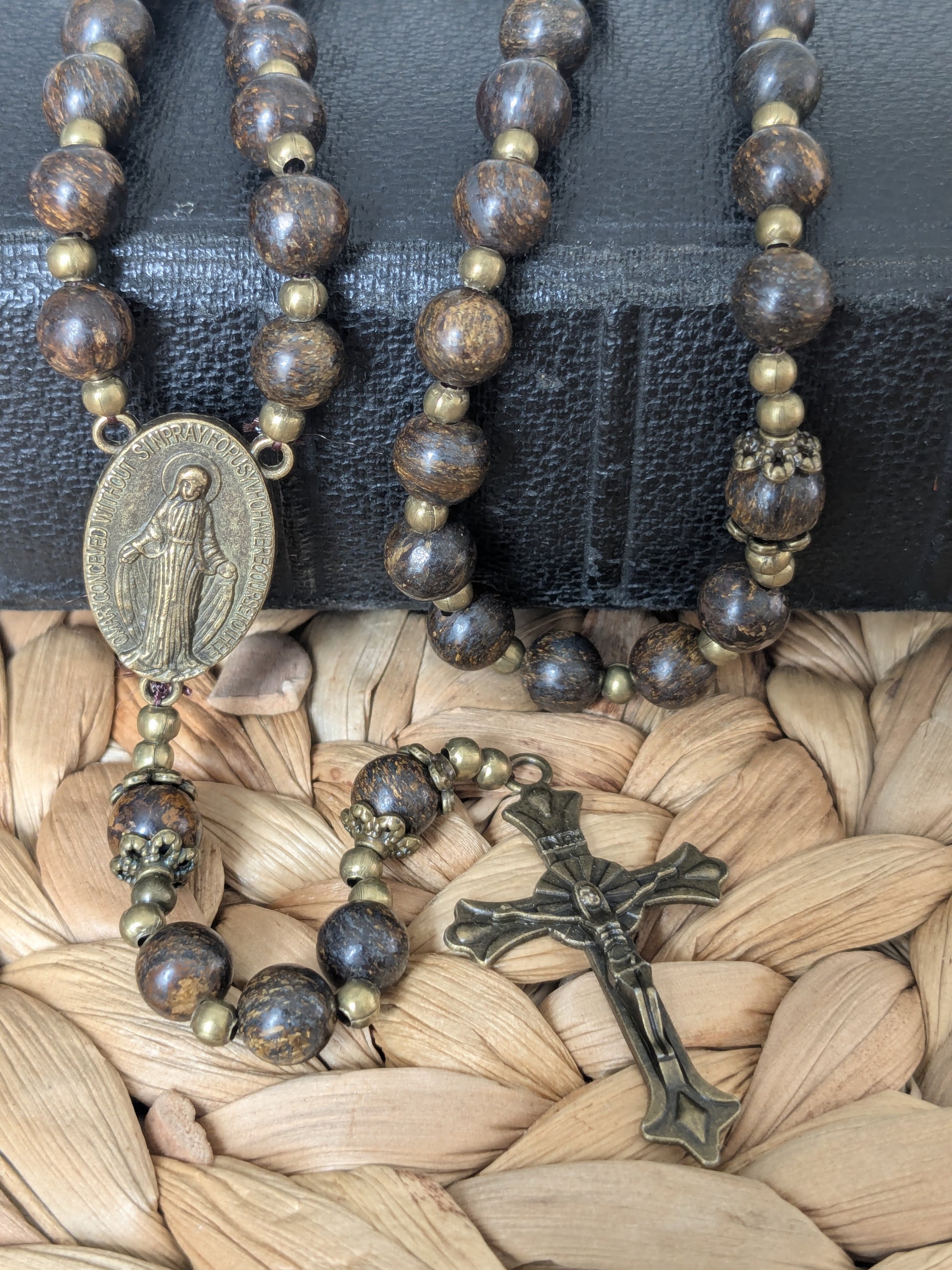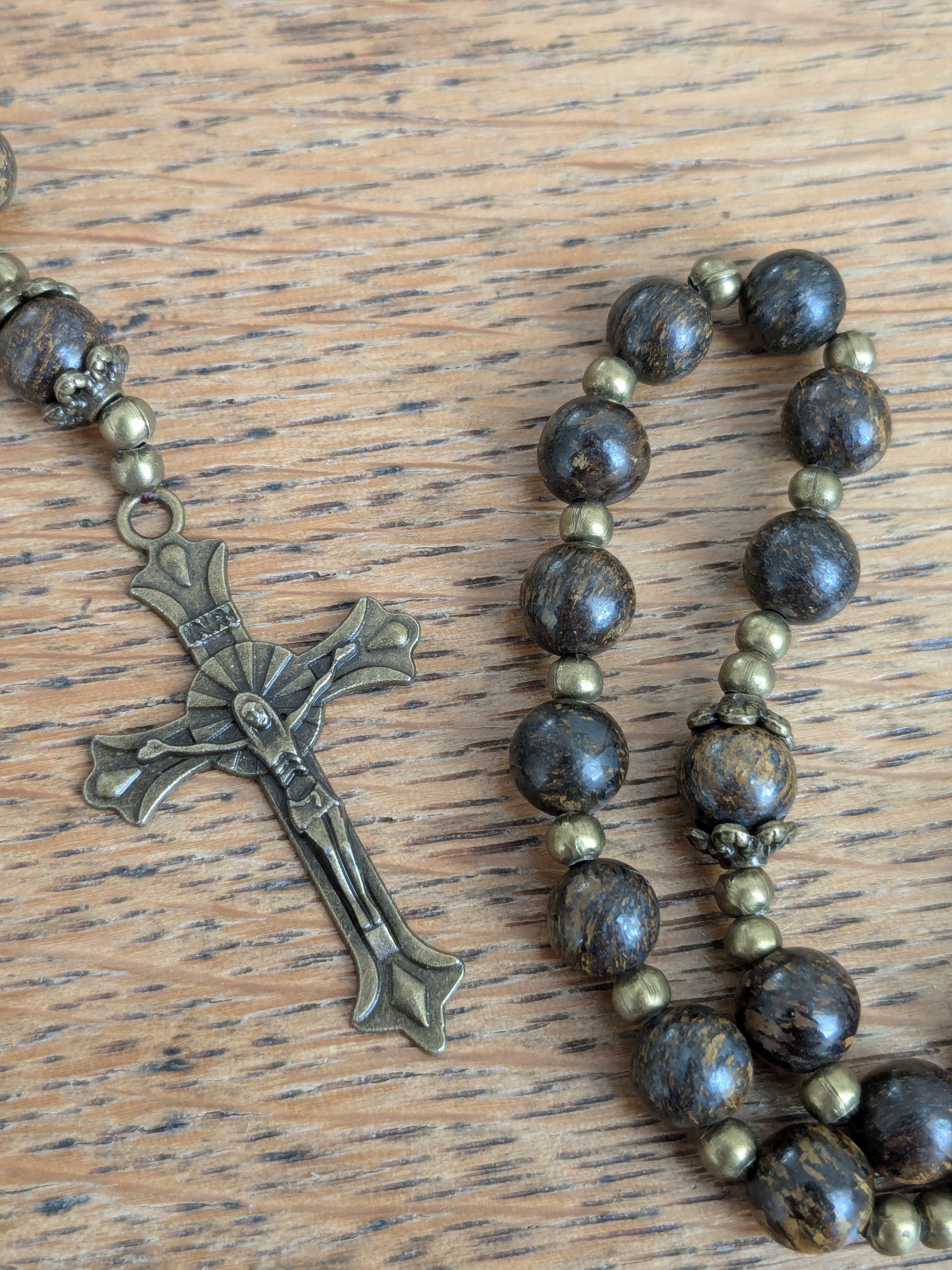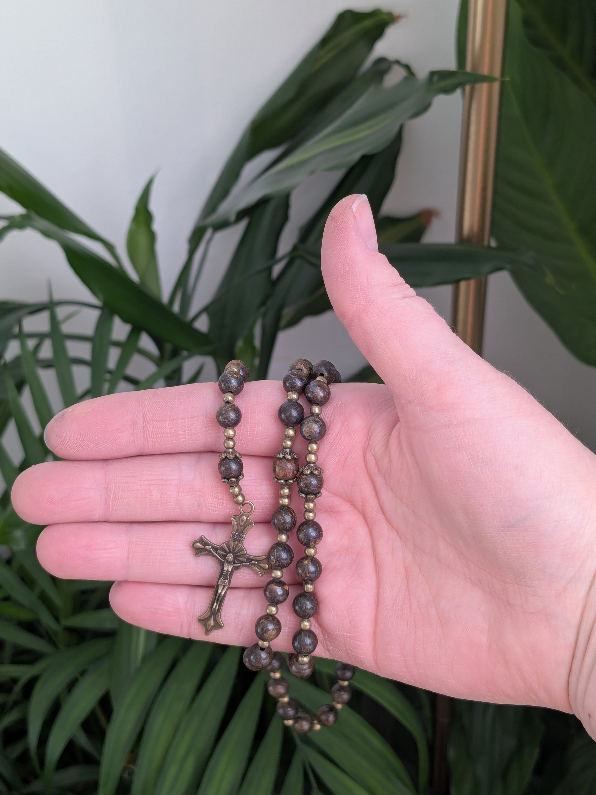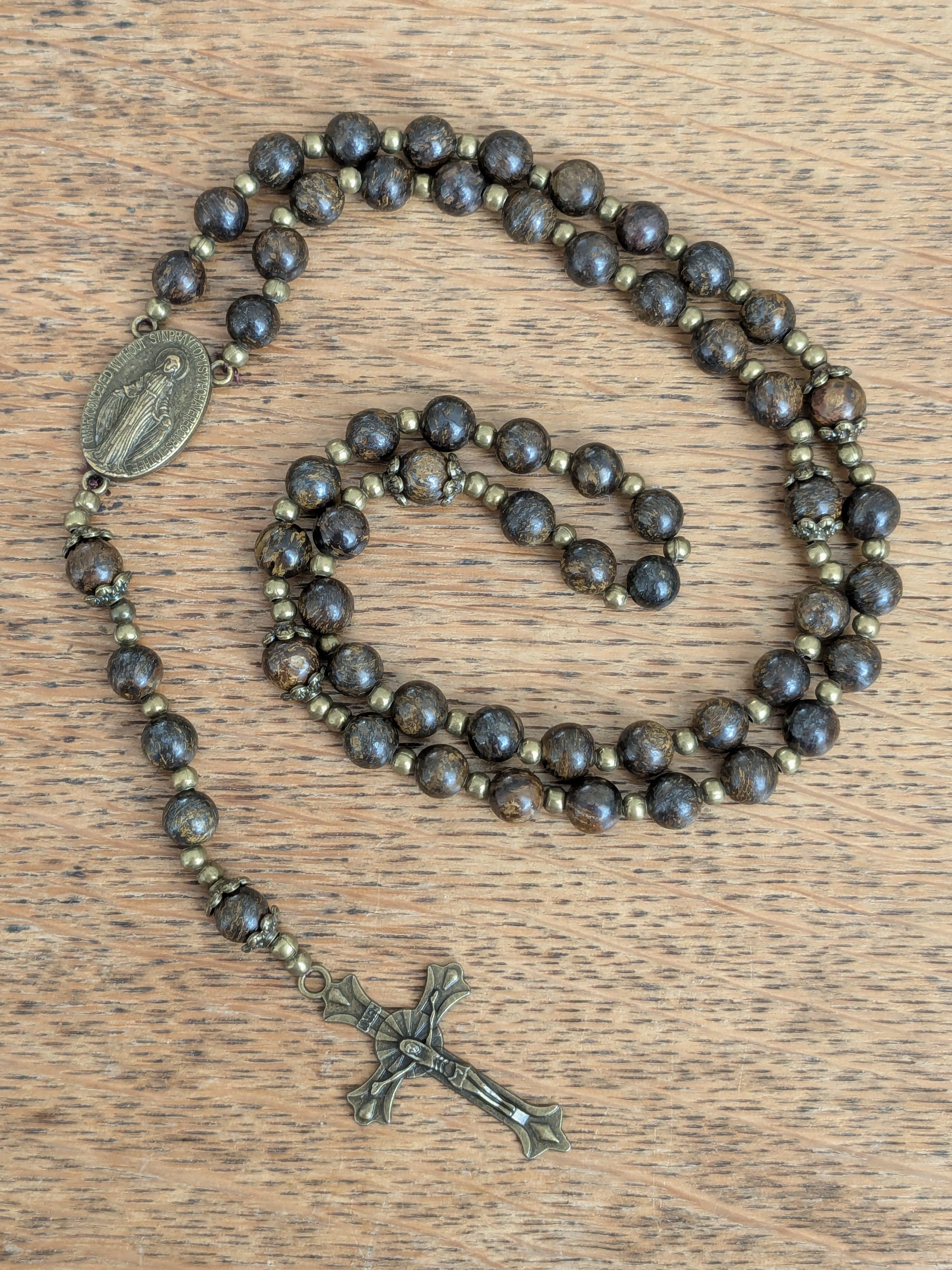 Découvrez ce magnifique chapelet catholique de confection artisanale, qui vous accompagnera dans toutes vos prières. Il est composé de véritable pierres en Bronzite, d'une médaille de la Vierge Marie et d'une croix en bronze.