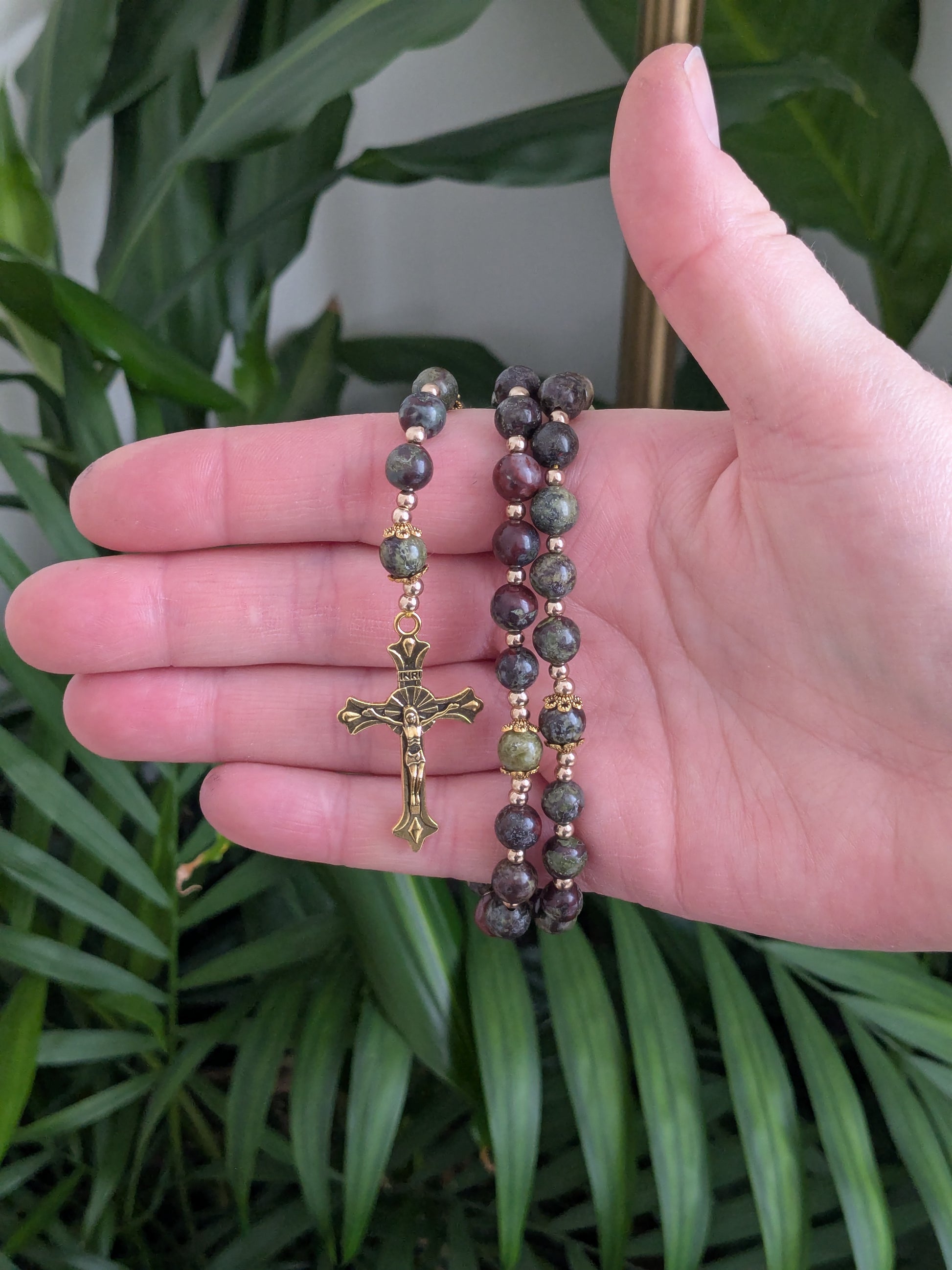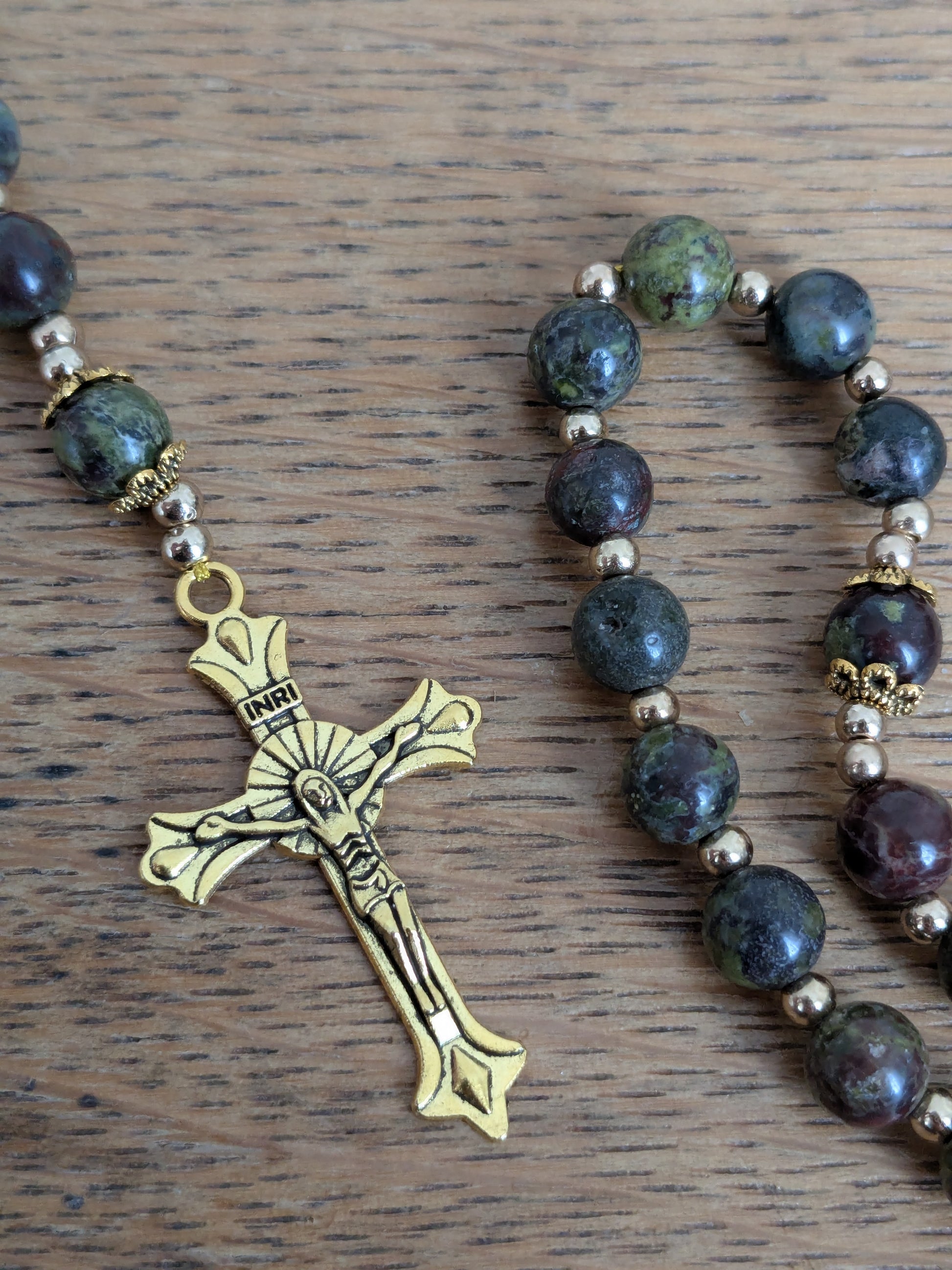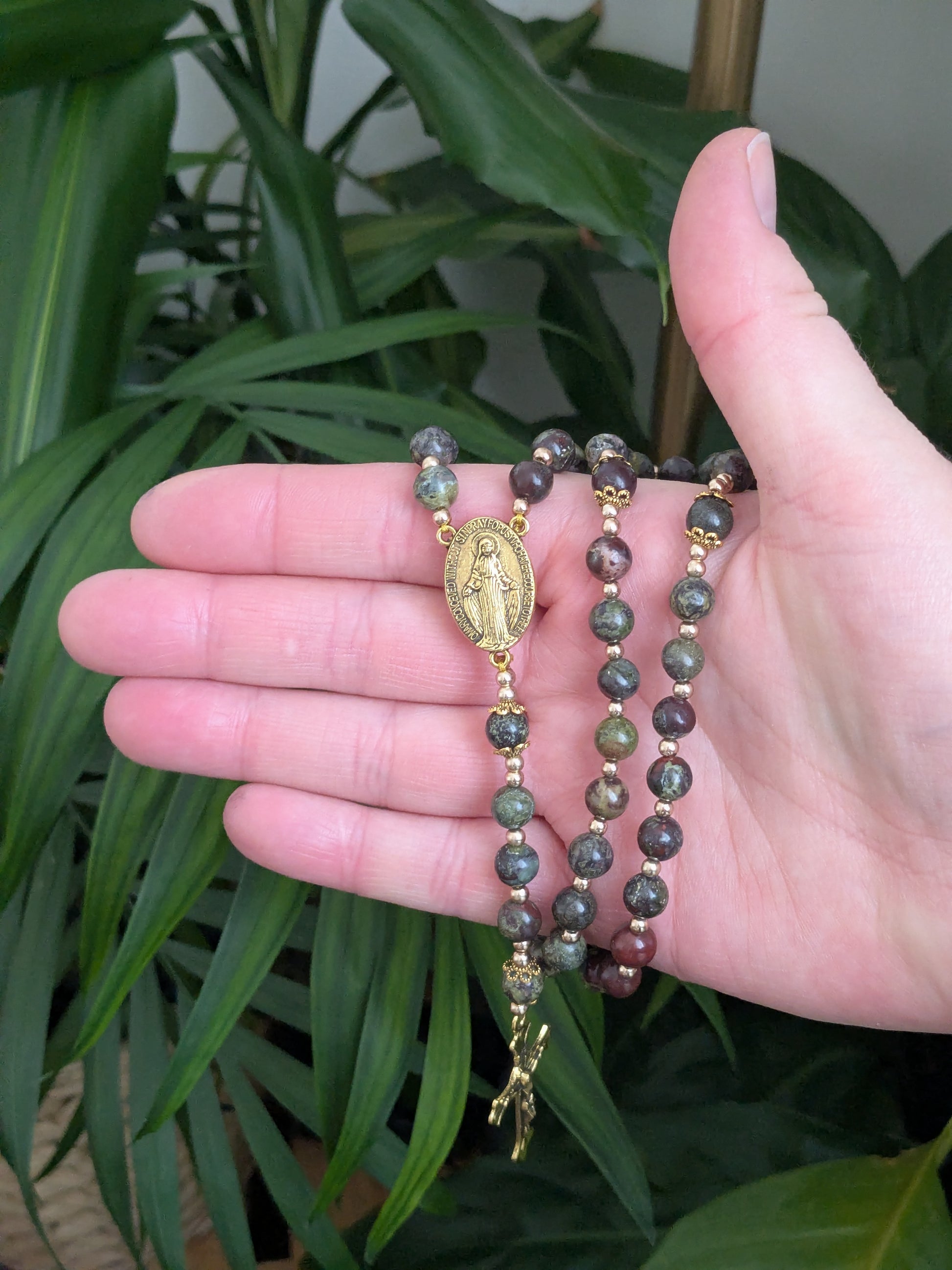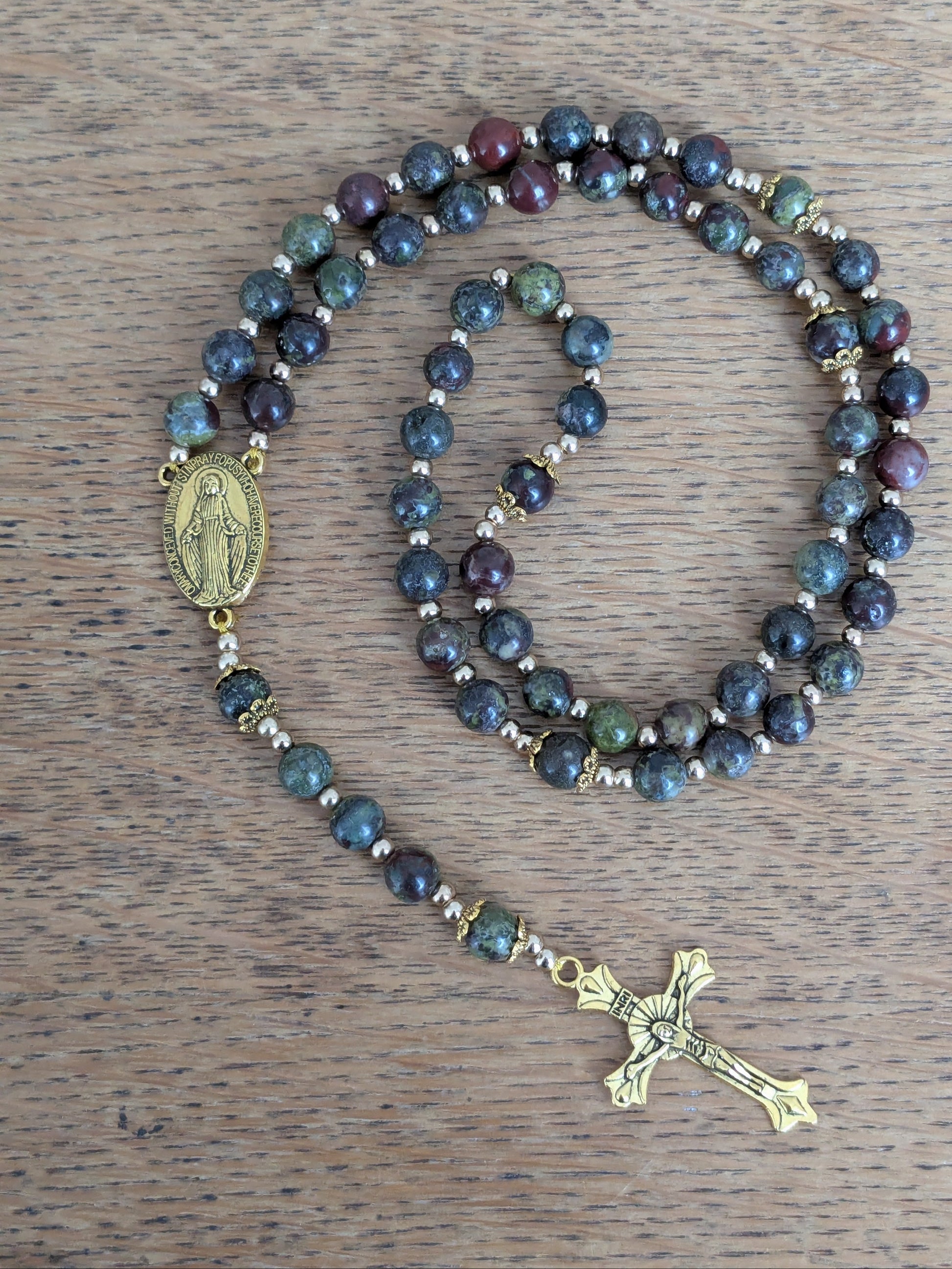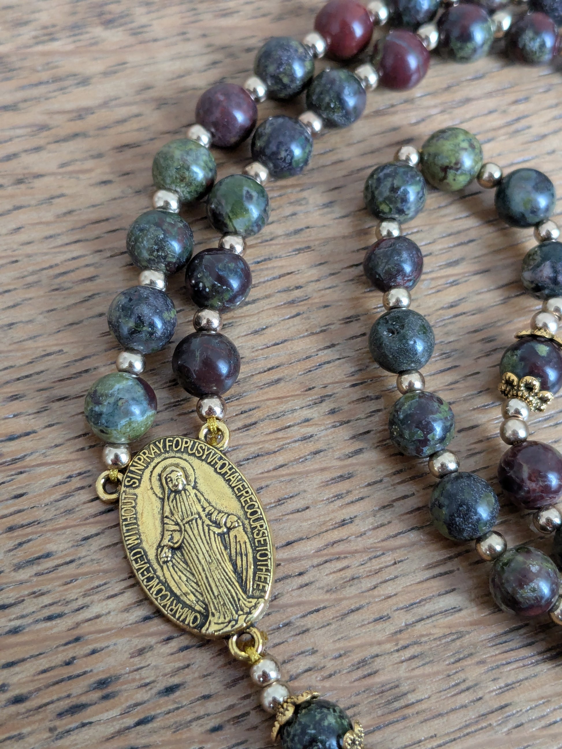 Découvrez ce magnifique chapelet catholique de confection artisanale, qui vous accompagnera dans toutes vos prières. Il est composé de véritables pierres en Jaspe Sang de Dragon, d'une médaille de la Vierge Marie et d'une croix catholique dorées.
