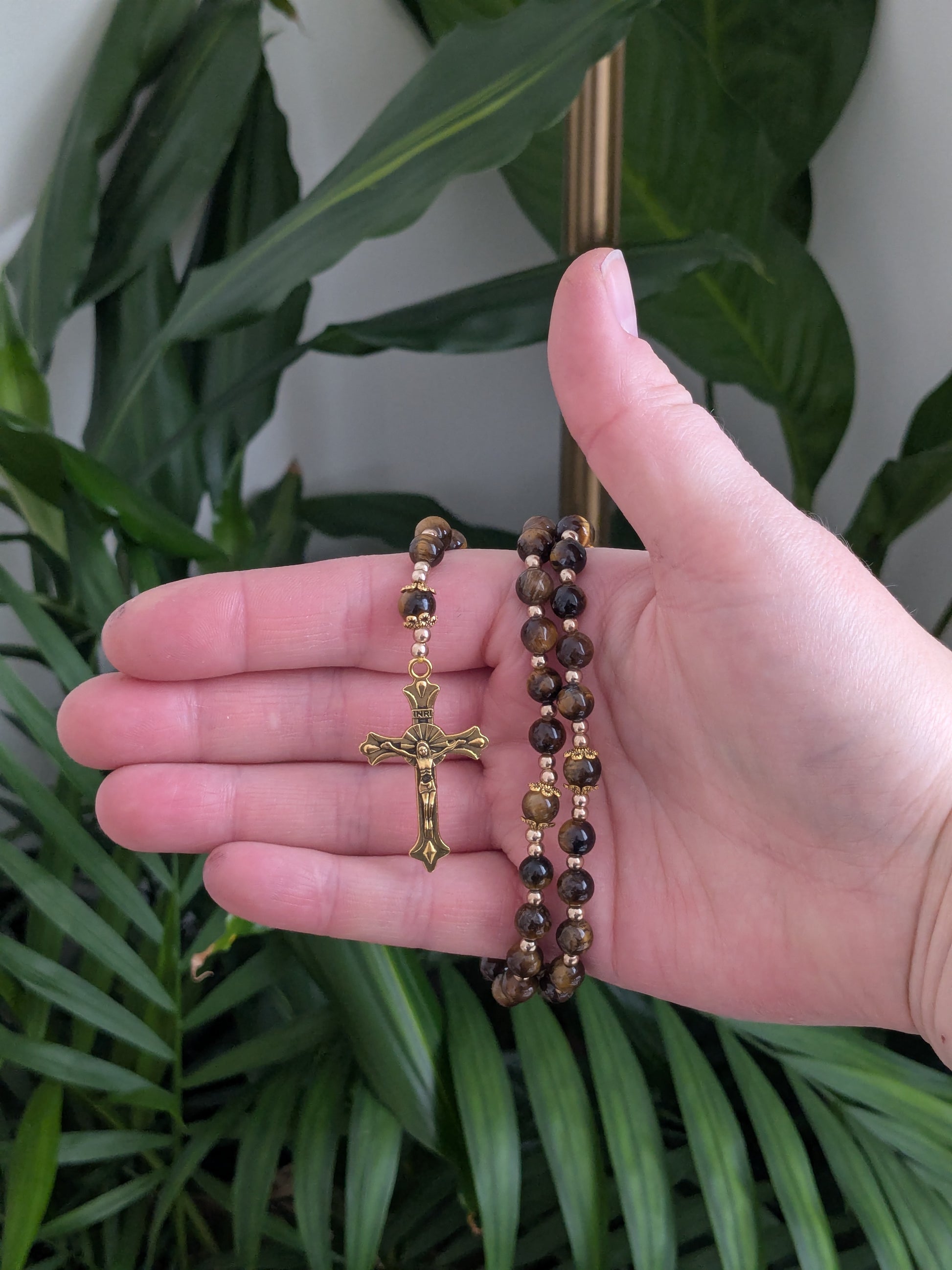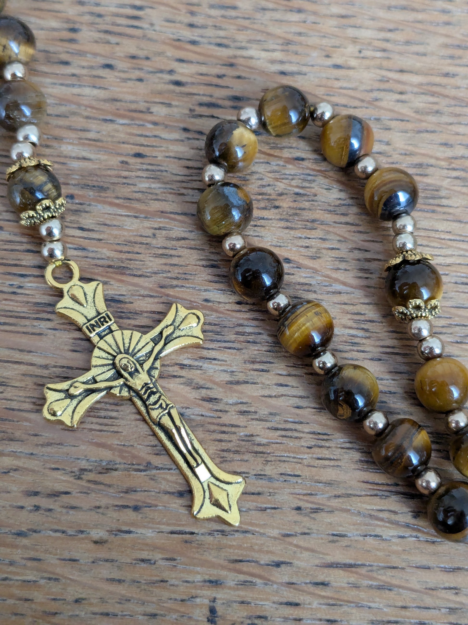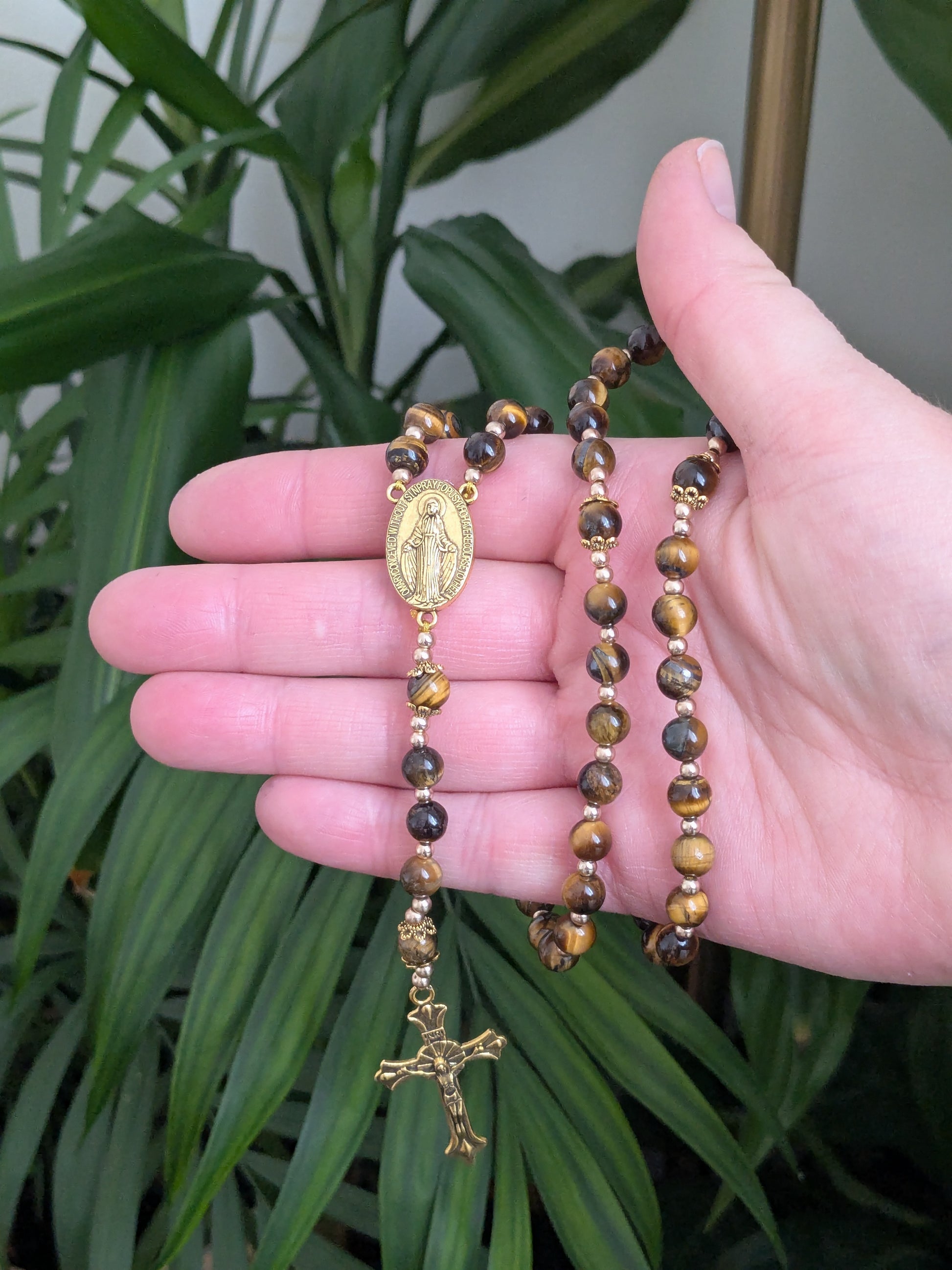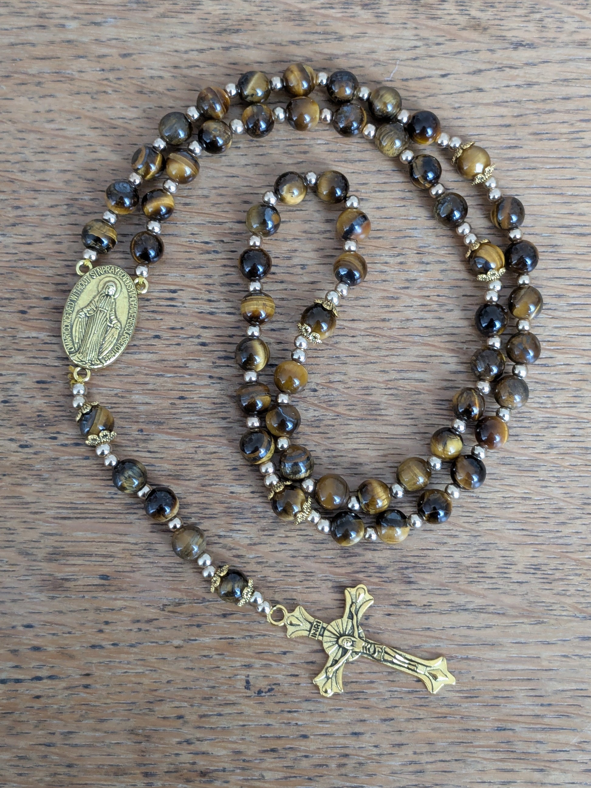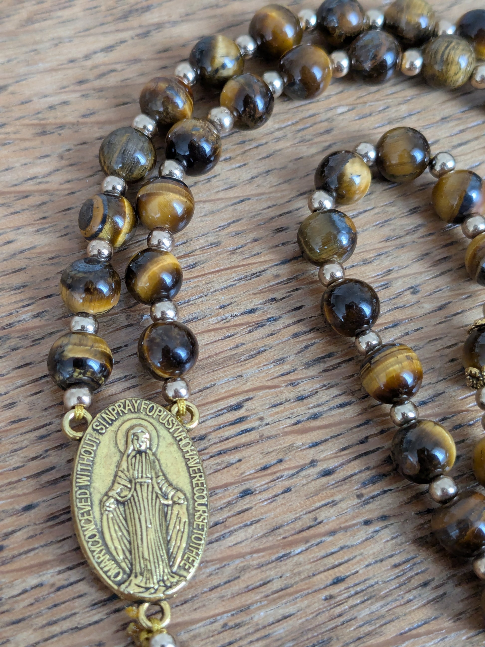 Découvrez ce magnifique chapelet catholique de confection artisanale, qui vous accompagnera dans toutes vos prières. Il est composé de véritables pierres en Oeil de Tigre, d'une médaille de la Vierge Marie et d'une croix catholique dorées.