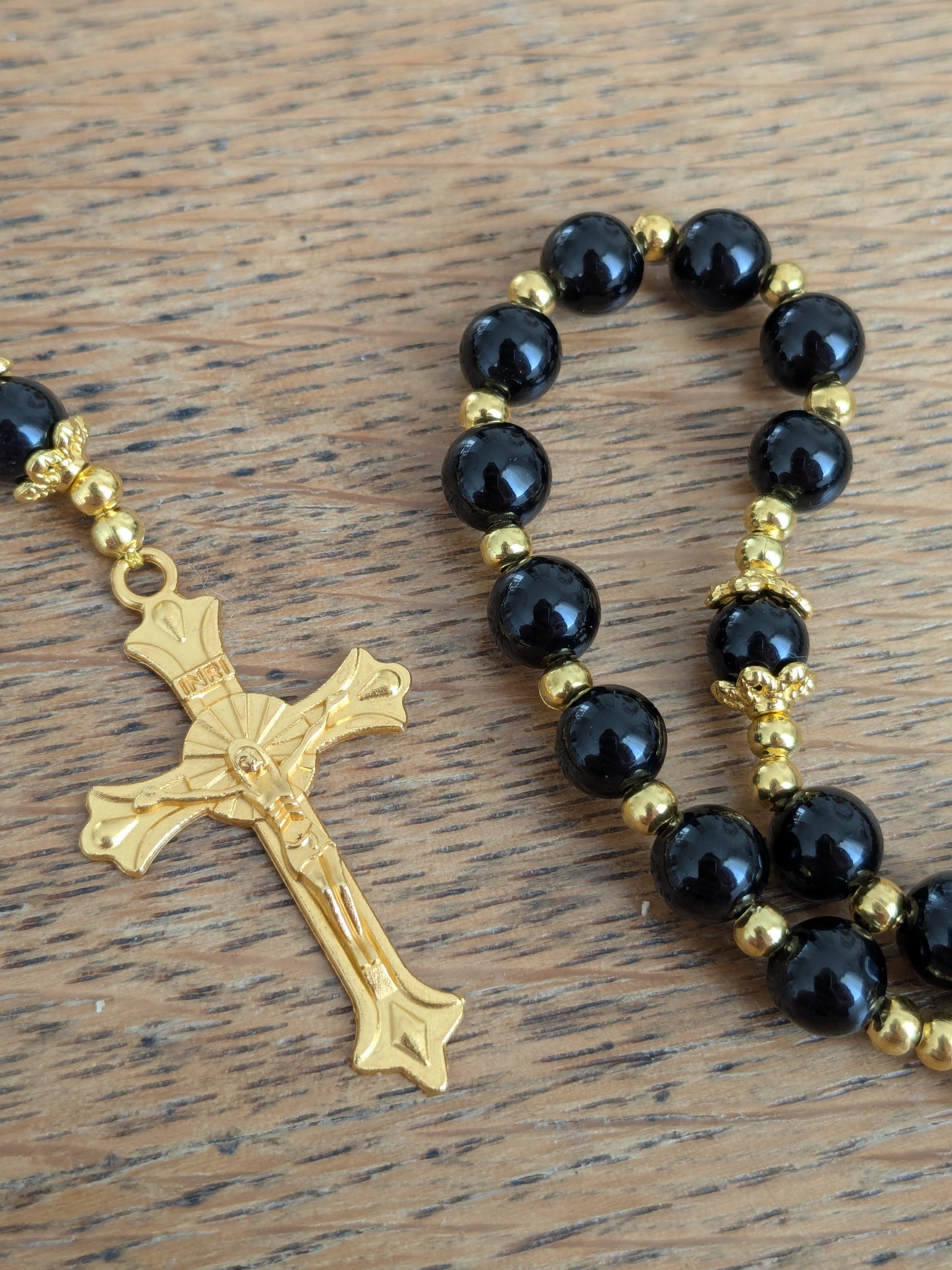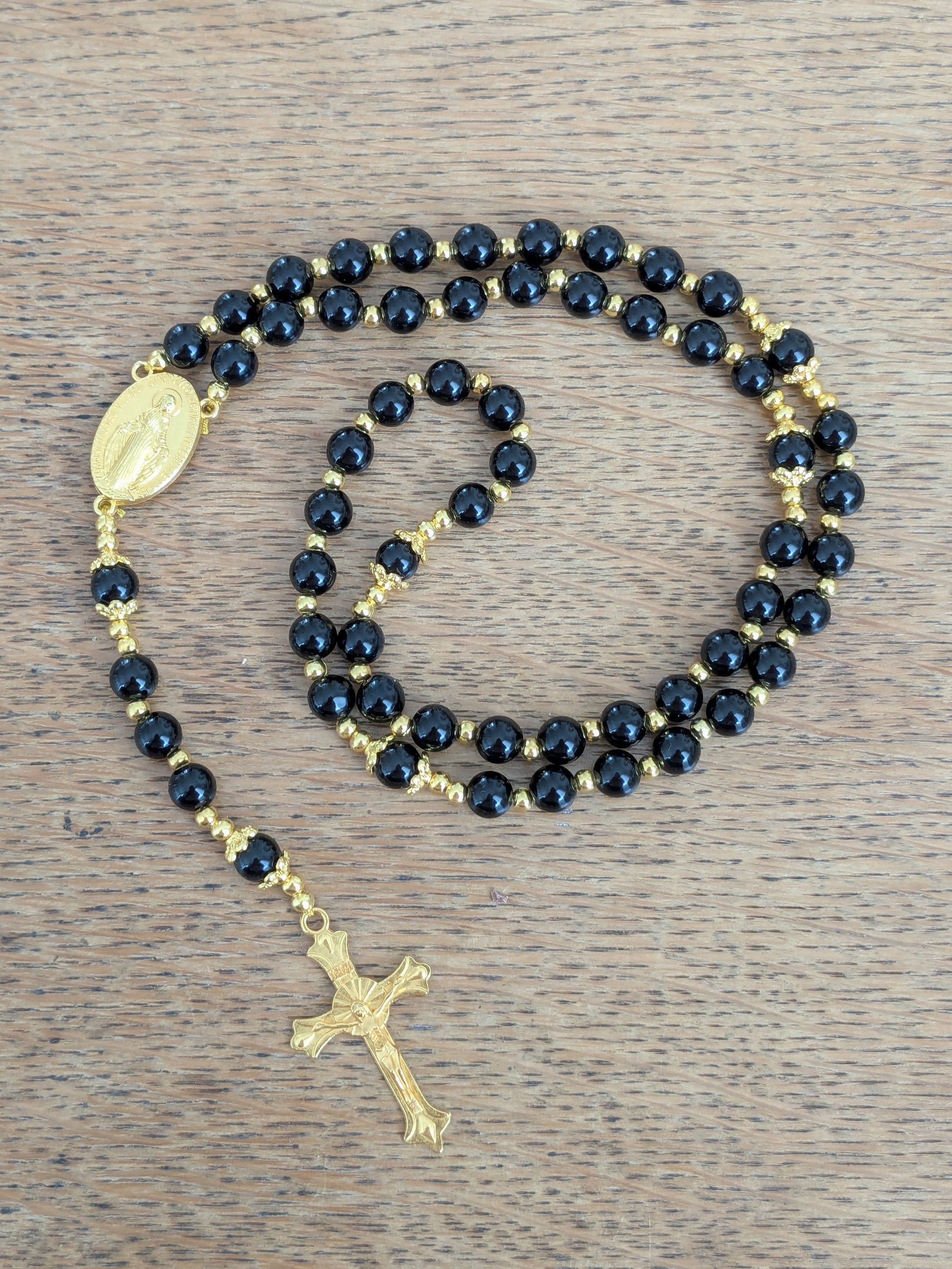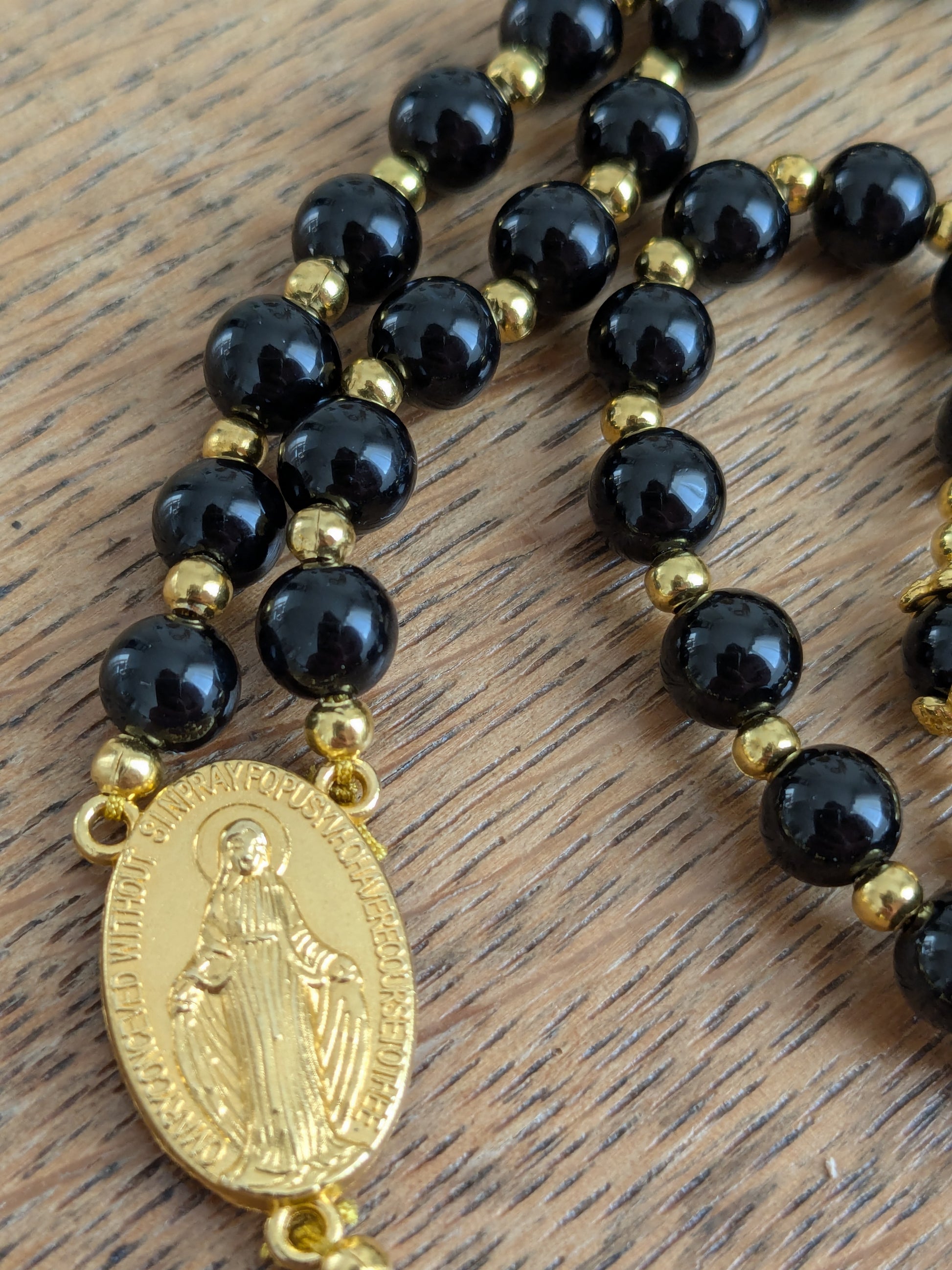 Découvrez ce magnifique chapelet catholique de confection artisanale, qui vous accompagnera dans toutes vos prières. Il est composé de véritables pierres en Onyx, d'une médaille de la Vierge Marie et d'une croix catholique dorées.