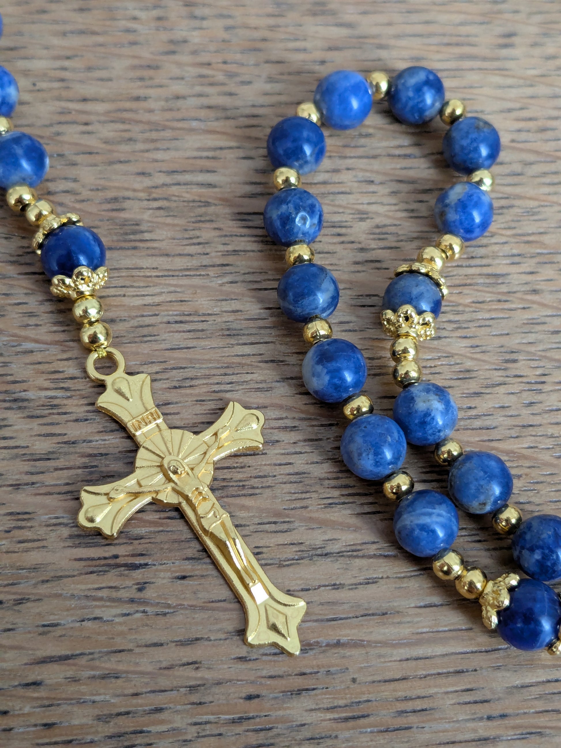 Découvrez ce magnifique chapelet catholique de confection artisanale, qui vous accompagnera dans toutes vos prières. Il est composé de véritables pierres en Sodalite, d'une médaille de la Vierge Marie et d'une croix en dorées.