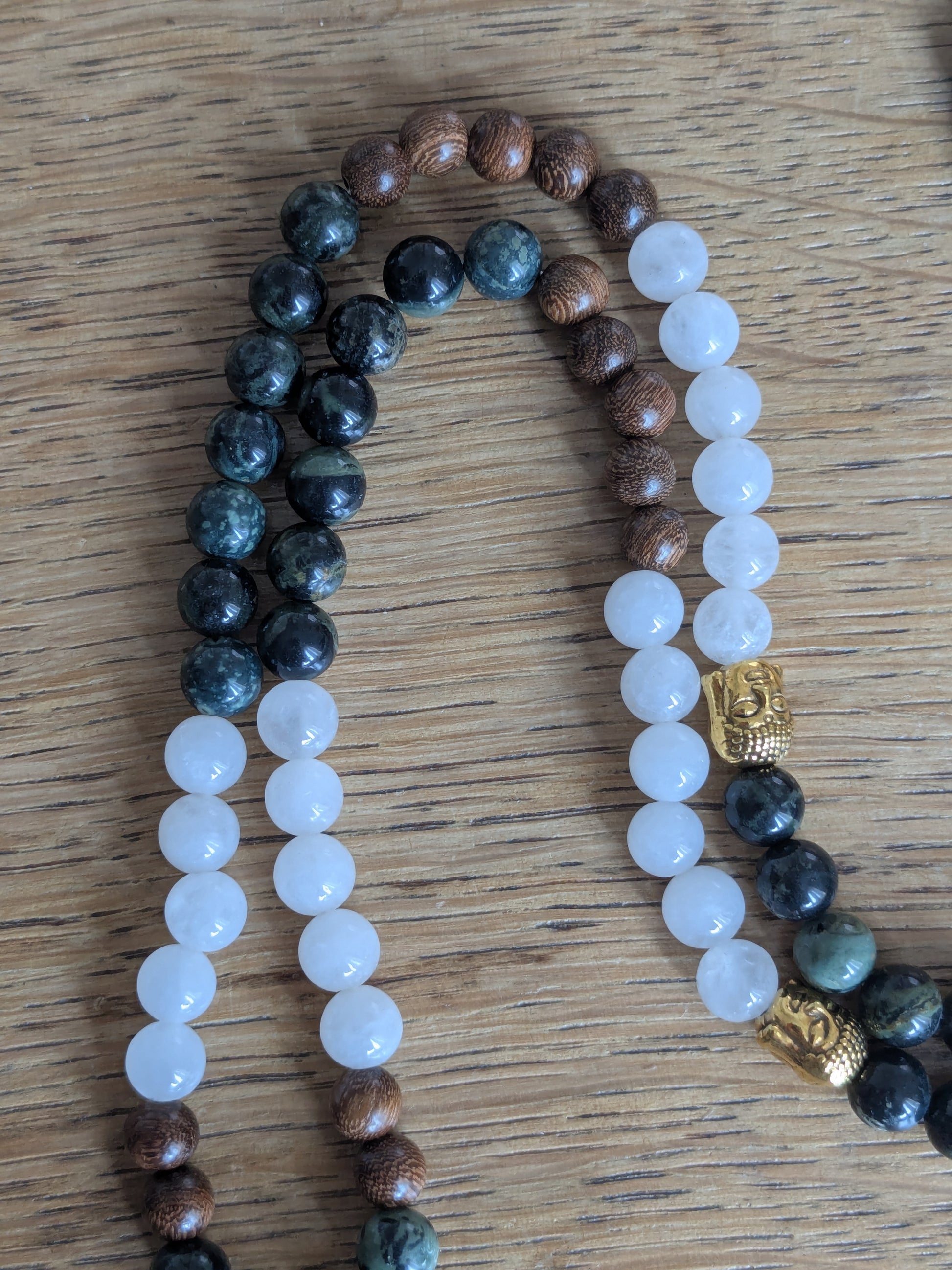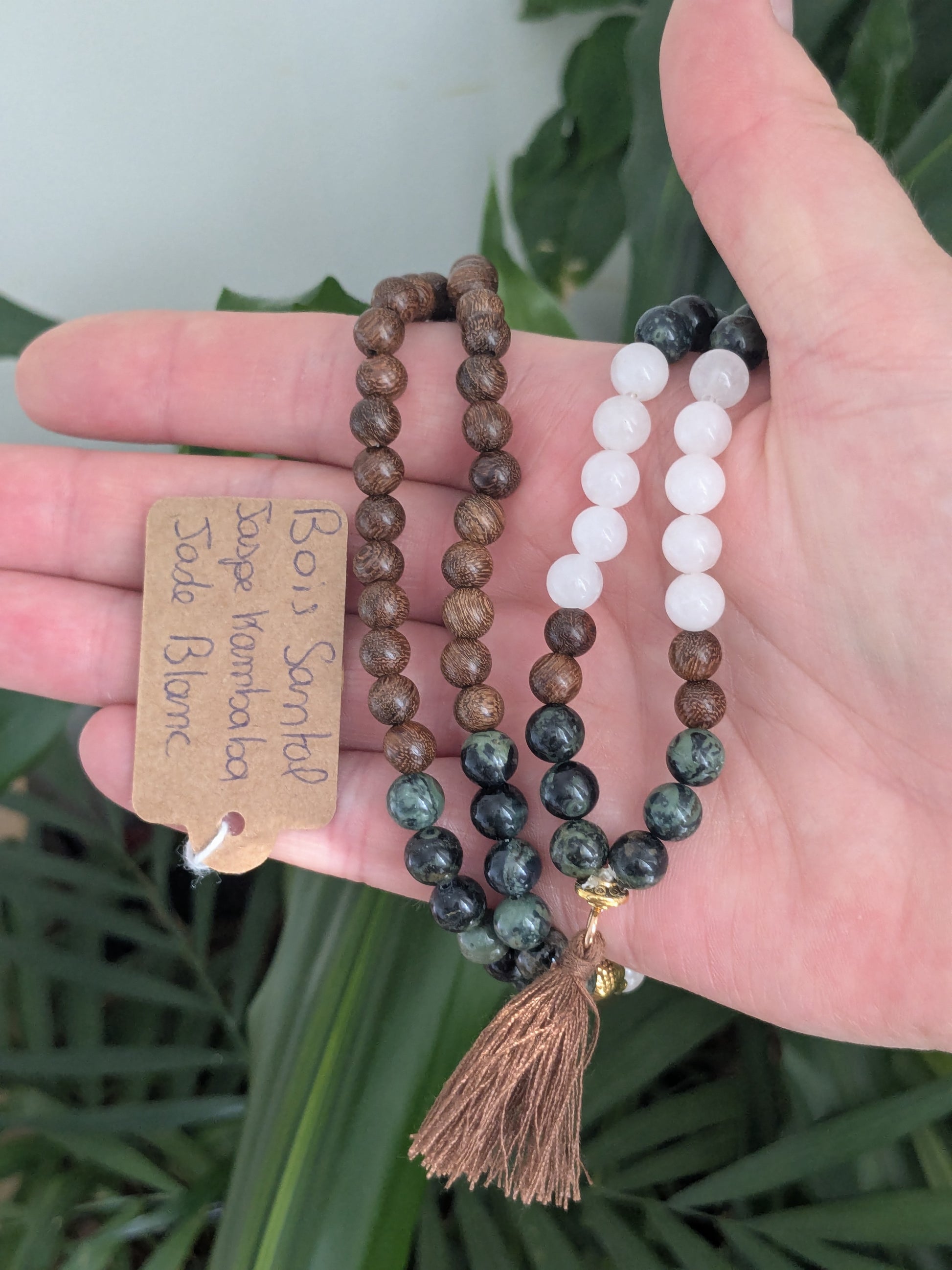 Découvrez ce magnifique mala de confection artisanale qui vous accompagnera dans toutes vos méditations. Il est composé 108 perles naturelles de Jade blanc, Jaspe kambaba et Bois de Santal doré. Le Jade blanc apporte harmonie intérieure, sérénité et favorise la prise de décisions réfléchies. Le Jaspe kambaba ancre à la Terre, calme l’esprit et renforce la volonté pour surmonter les obstacles. Fabriqué avec amour Perles de 6mm de diamètre Longueur du mala : environ 42cm Pierres de qualité issues d’un grossiste français |